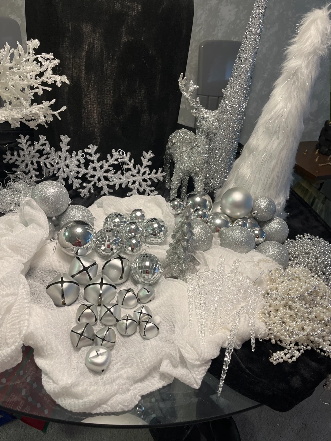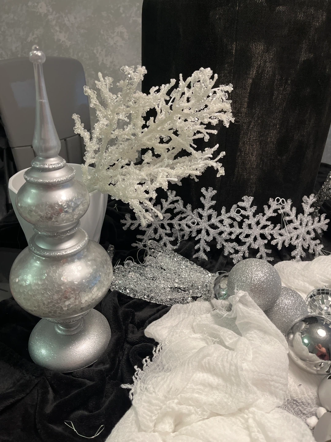 White feather tree , small silver glitter tree,silver glitter reindeer, white glitter