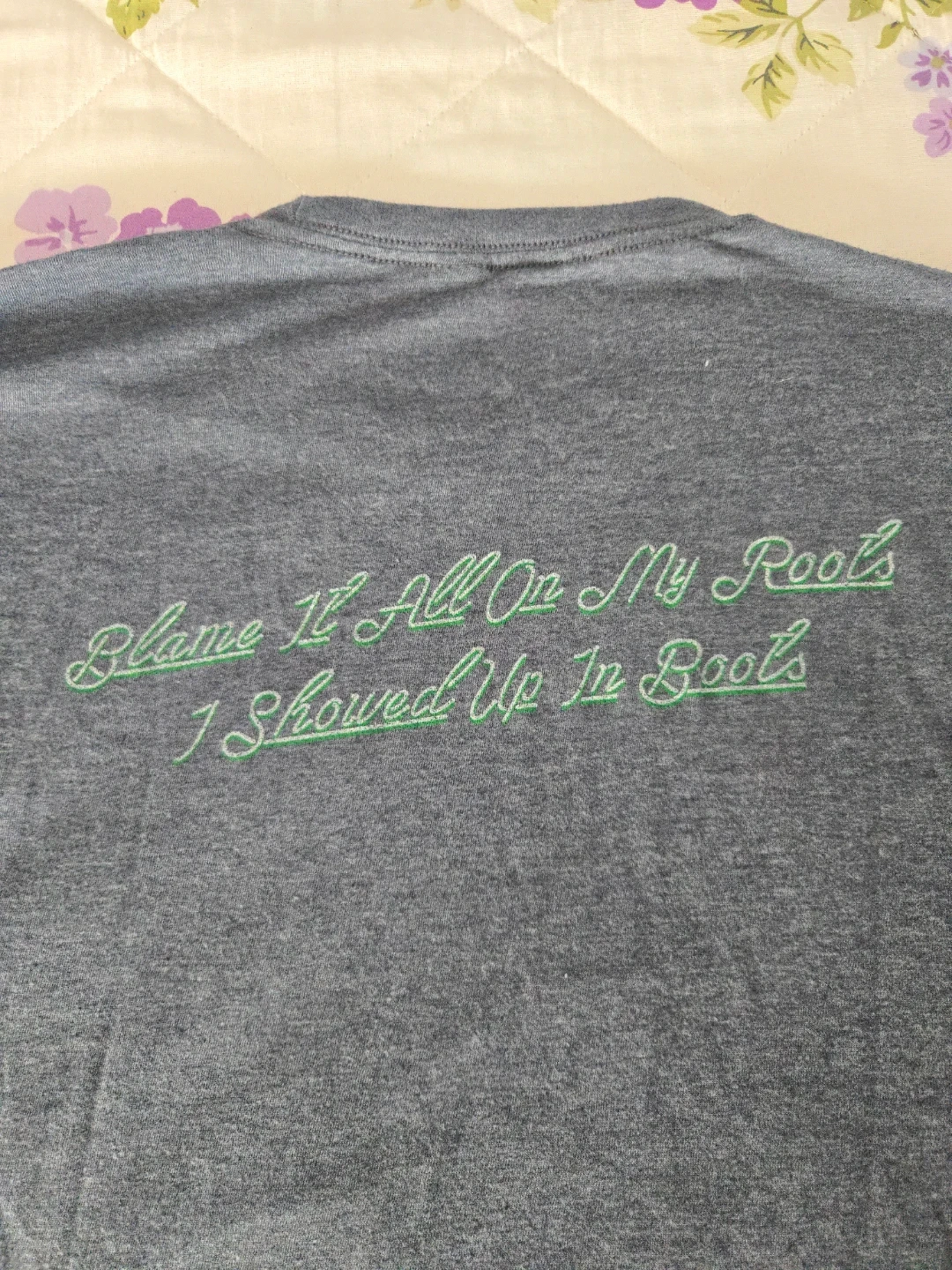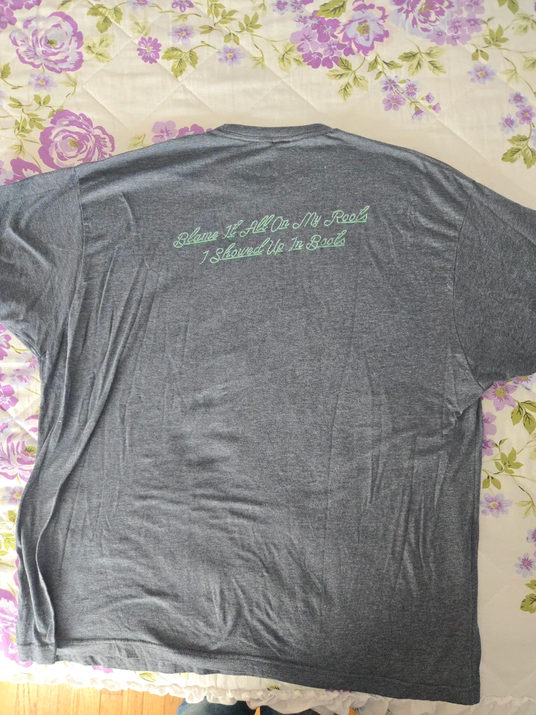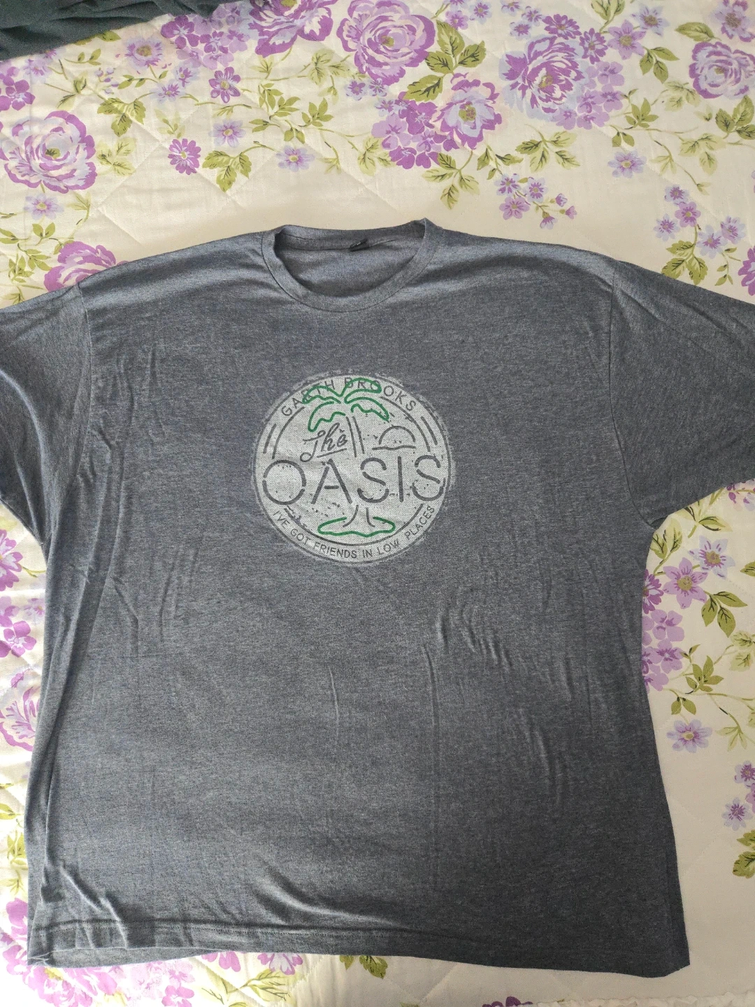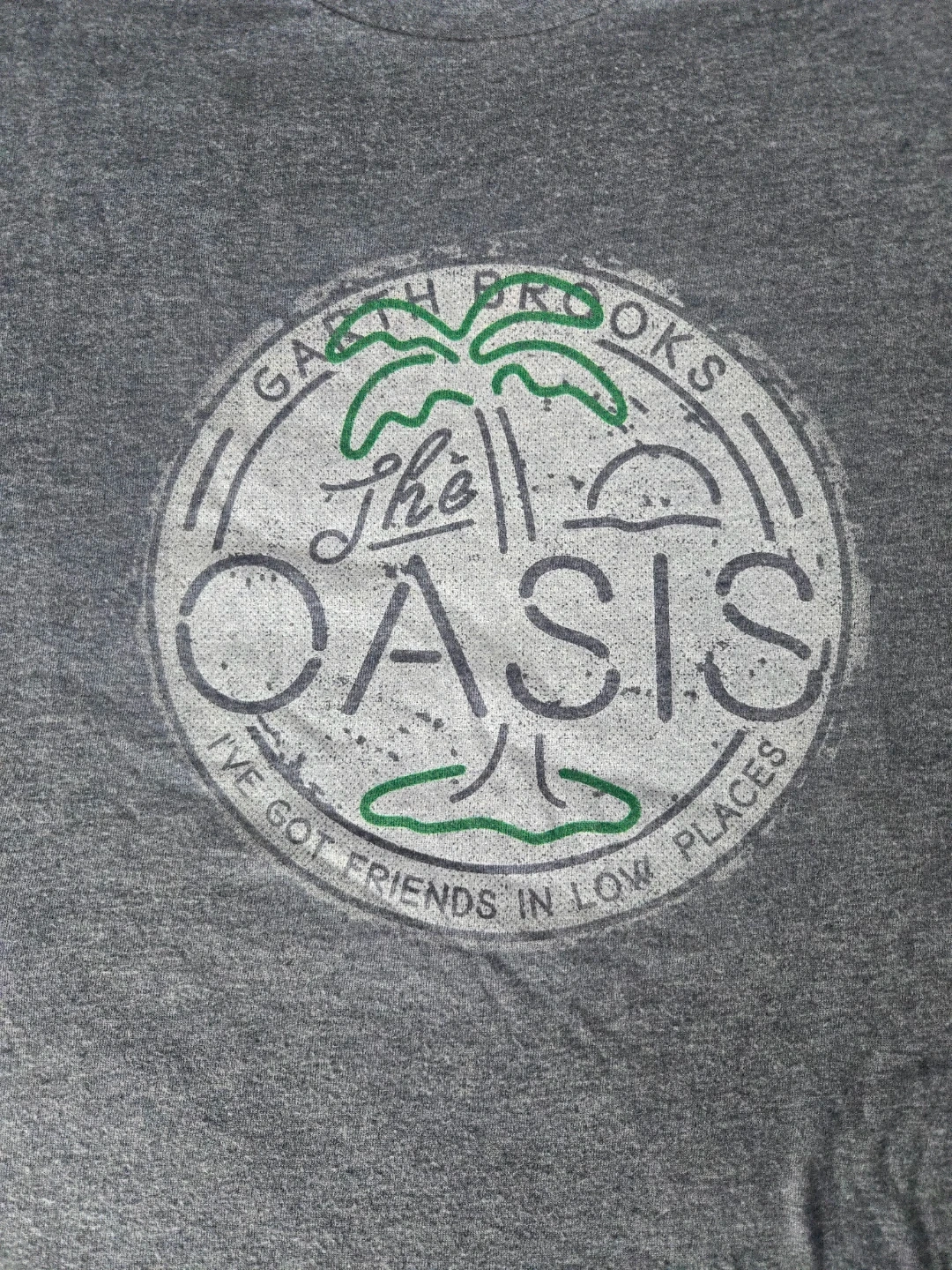 Grey t-shirt with "Garth Brooks The Oasis" graphic on the front. Back has text "Blame It All On My Roots I Showed Up In Boots".