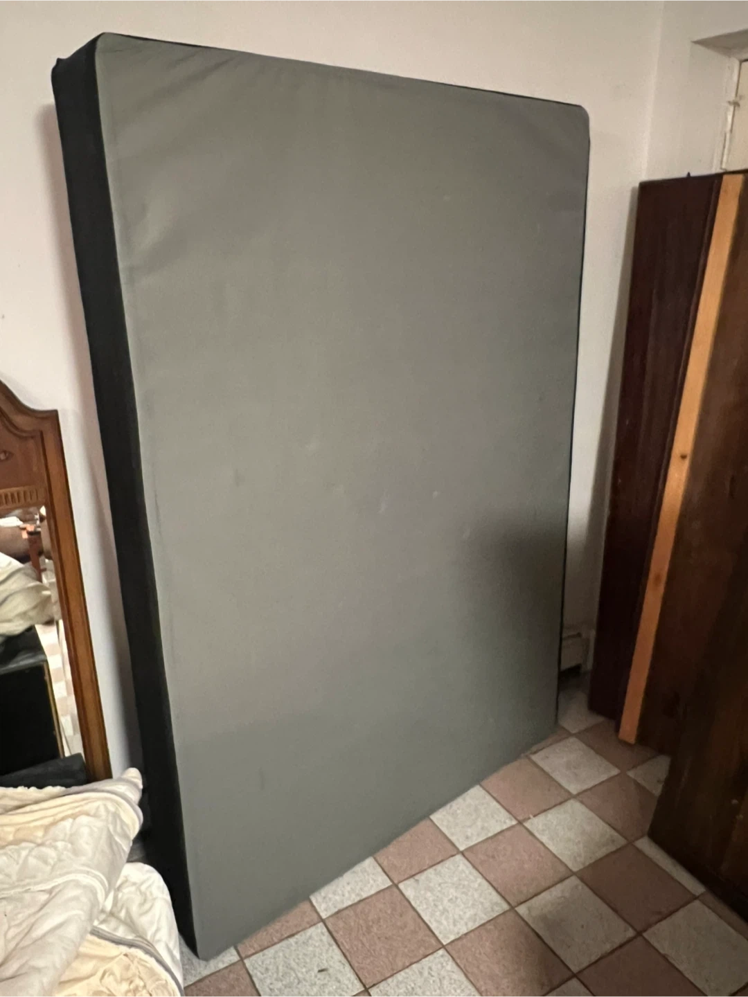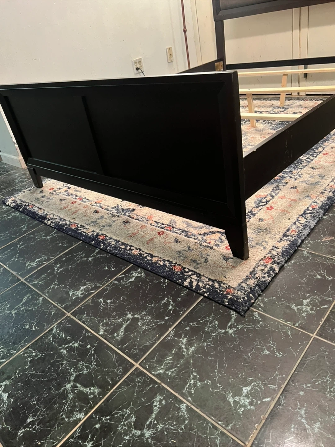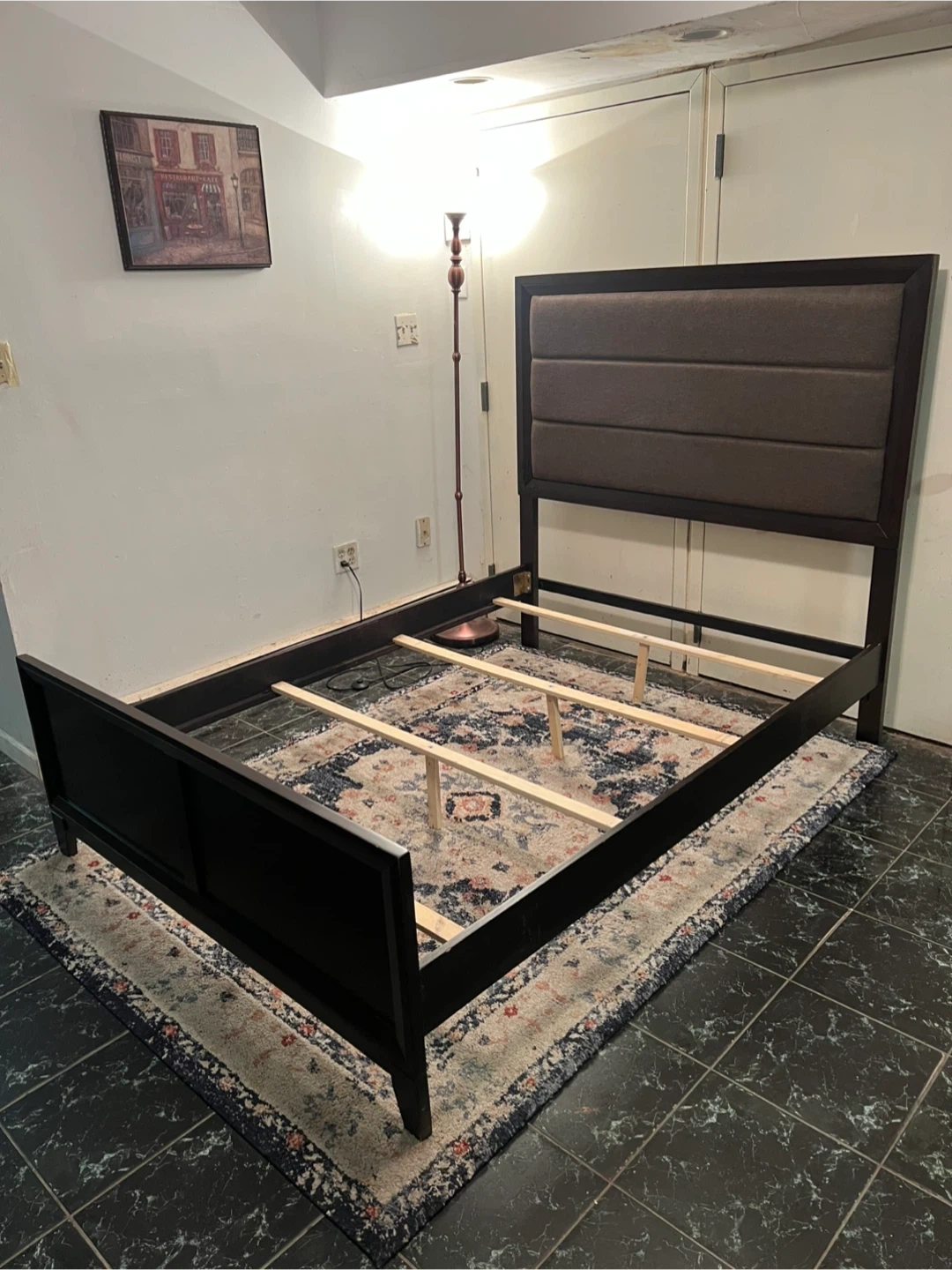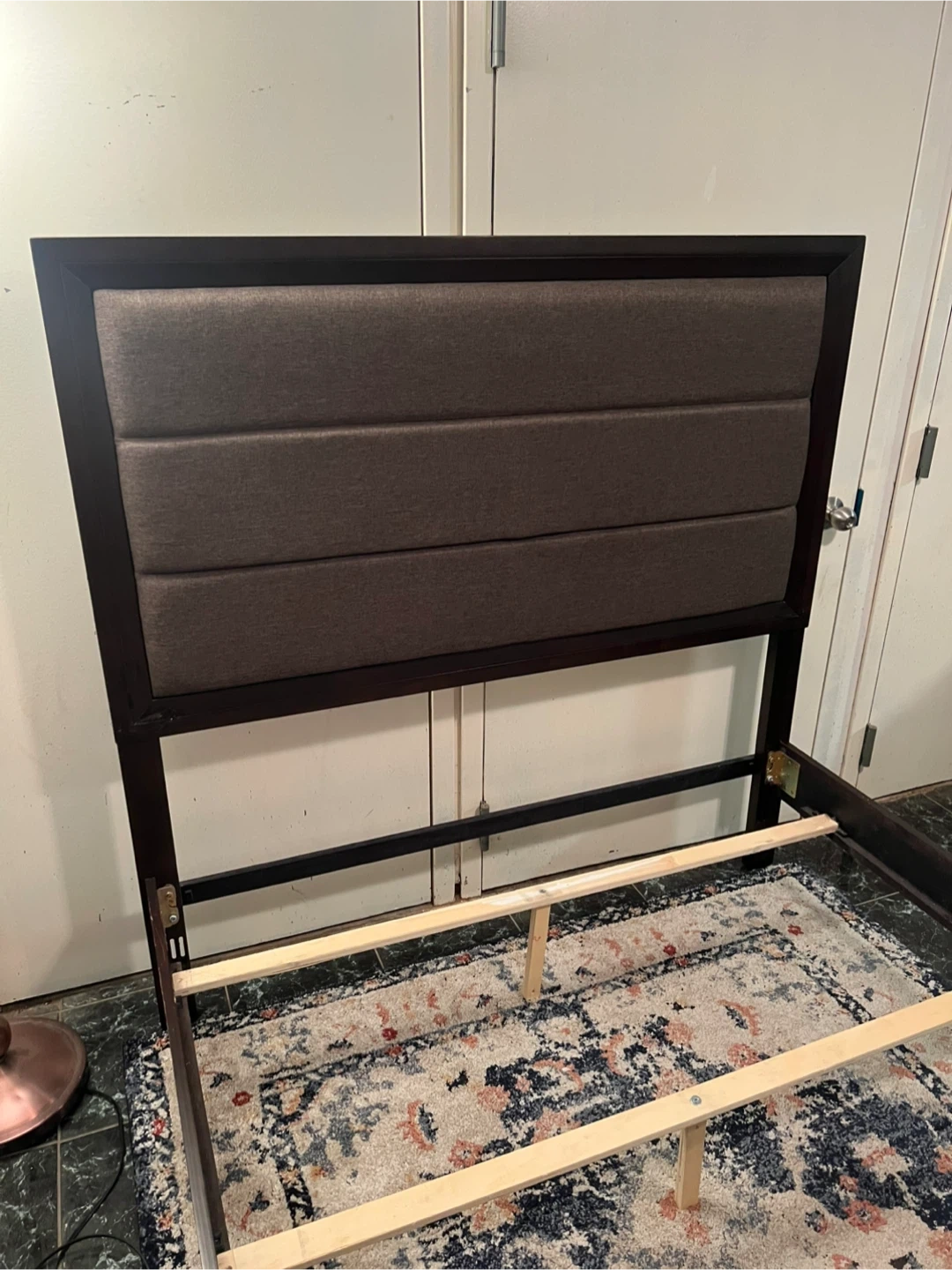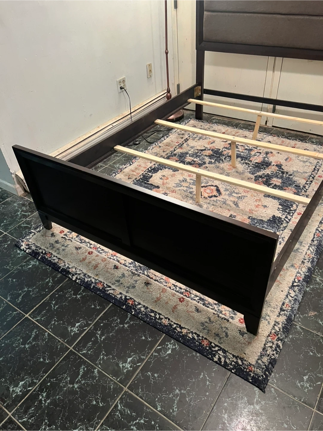 Selling dark brown wooden full-size bed frame with wooden mattress box. All hardware is included. Functional but has cosmetic imperfections.