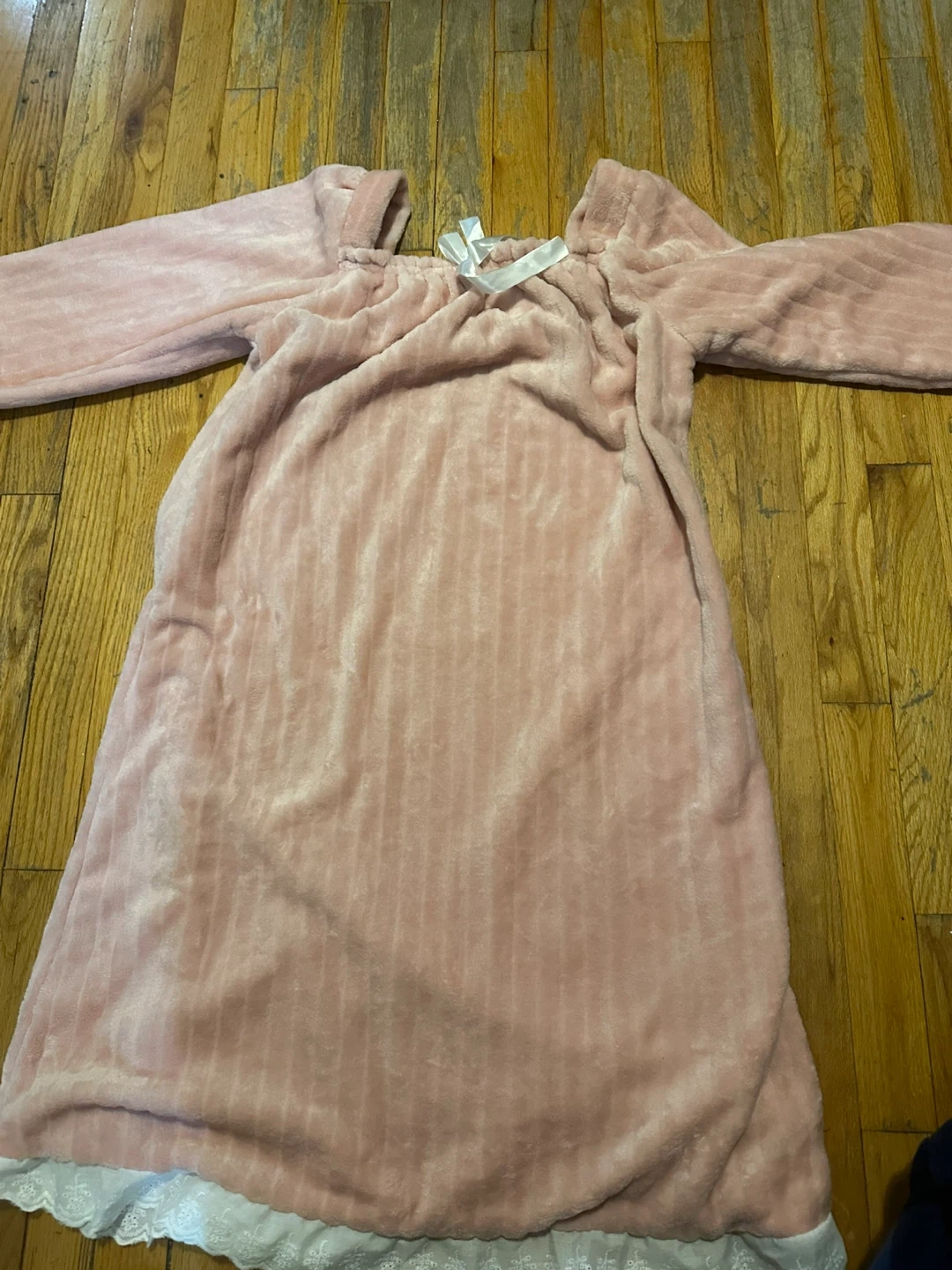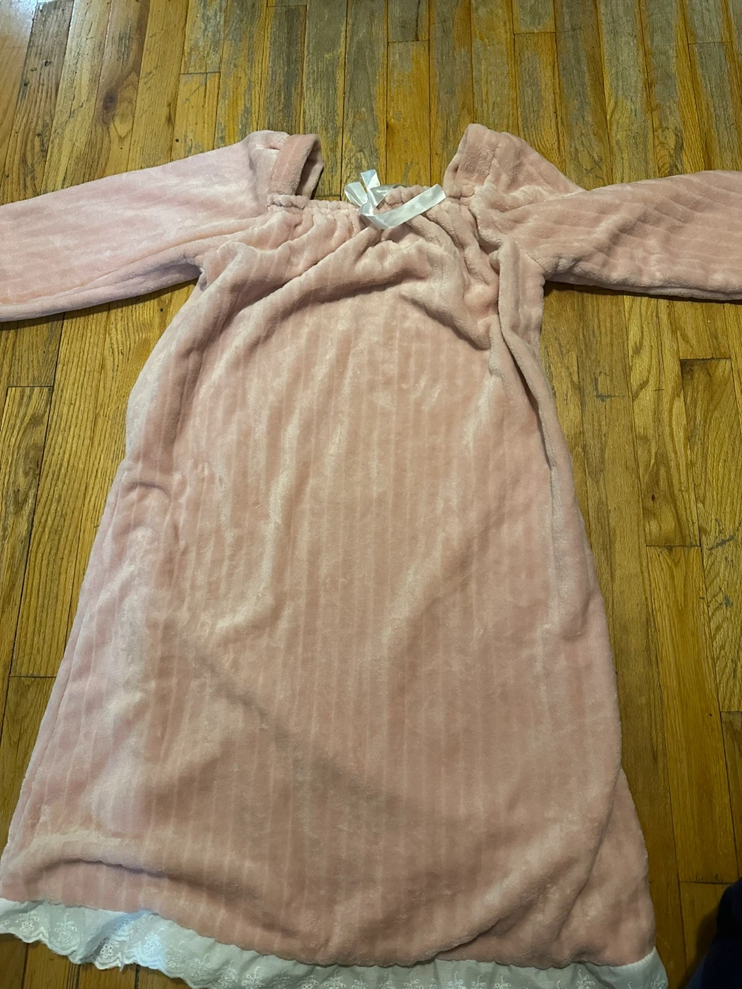 Selling a cozy pink pajama dress. It's a soft, plush material, perfect for lounging around the house. The dress has a cute ribbon detail at the neckline and a lace trim at the bottom. It's in great condition and ready for a new owner!