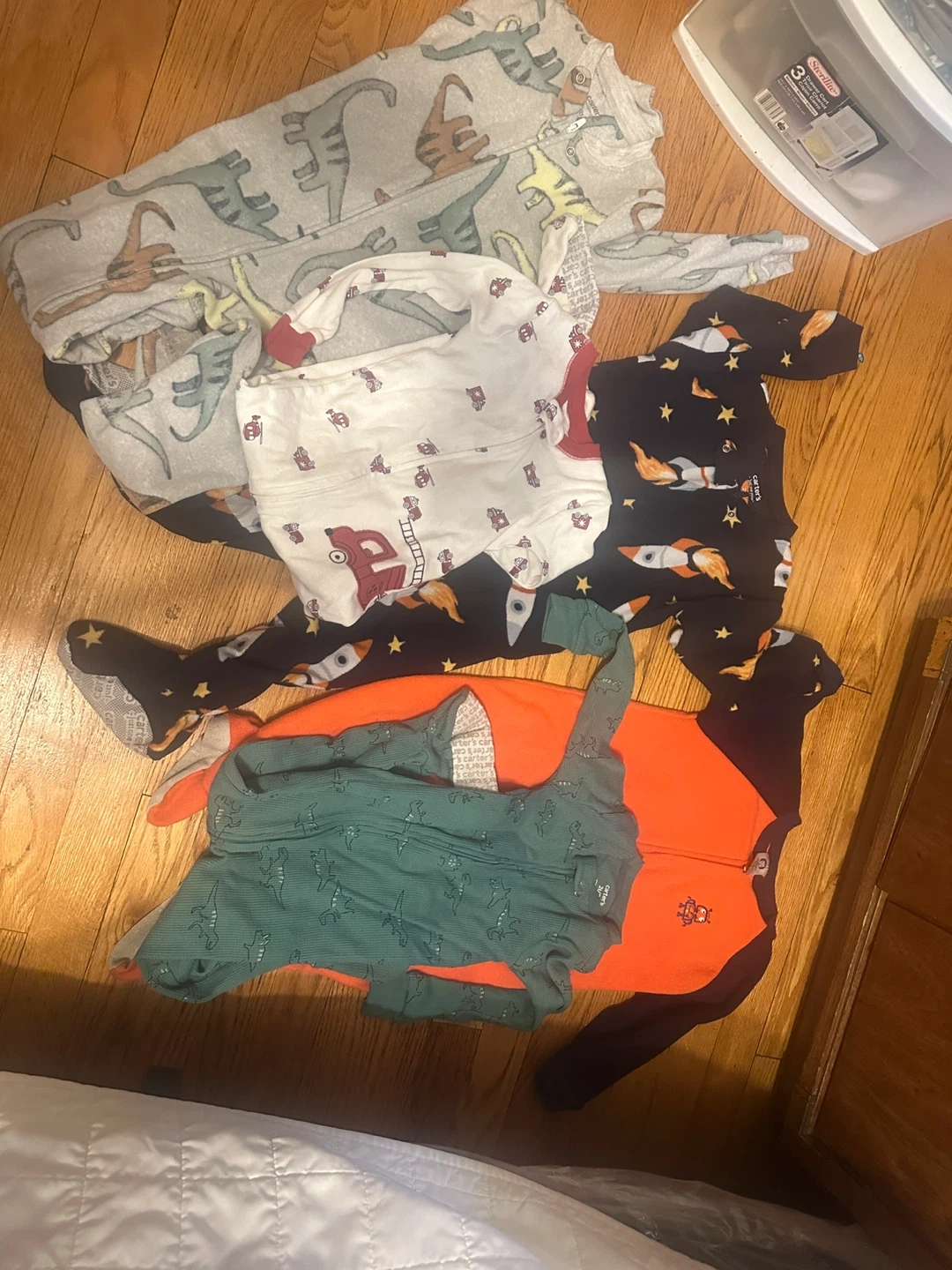 Five Carter's baby footie pajamas in various prints. Includes dinosaur, fire truck, and rocket ship designs. Zipper closures for easy dressing. Cotton material for comfort.