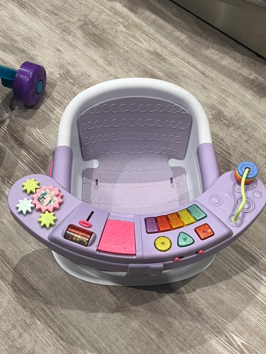 This Fisher-Price Laugh & Learn activity seat is designed for babies to sit and play. It features colorful interactive toys and sounds to entertain your little one. Made of durable plastic for easy cleaning.