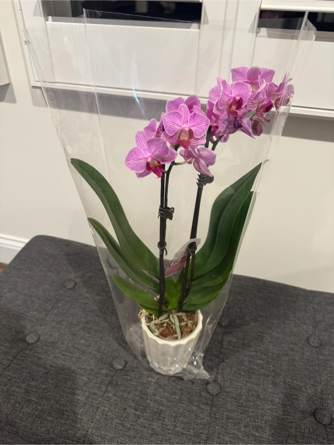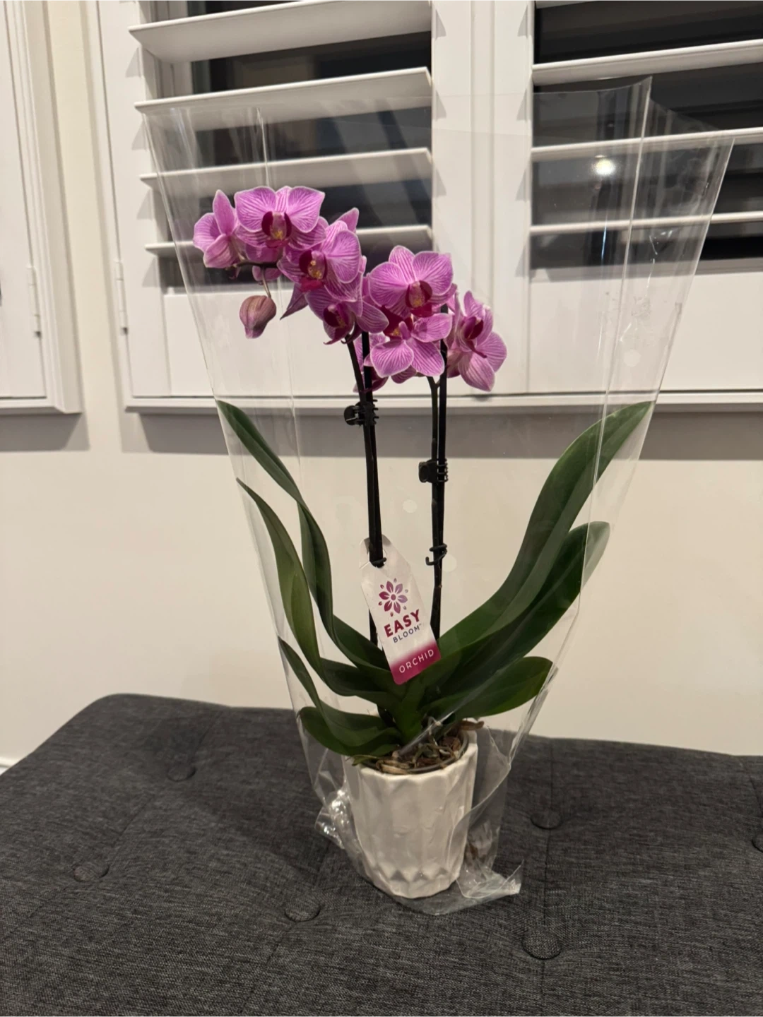 Selling a beautiful Easy Bloom orchid! It's in a cute white pot and has lovely pink and purple flowers. Perfect to brighten up any space. Need a new home!