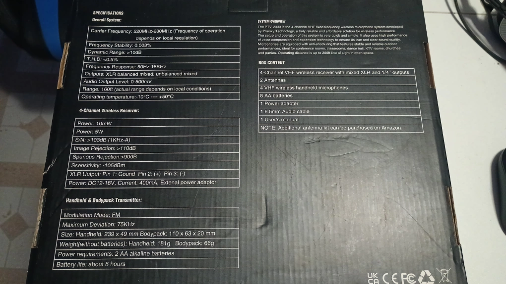 The box shows a wireless microphone system. The box has a black and white design, with a picture of the receiver and microphones. The box also contains technical specifications on the back.