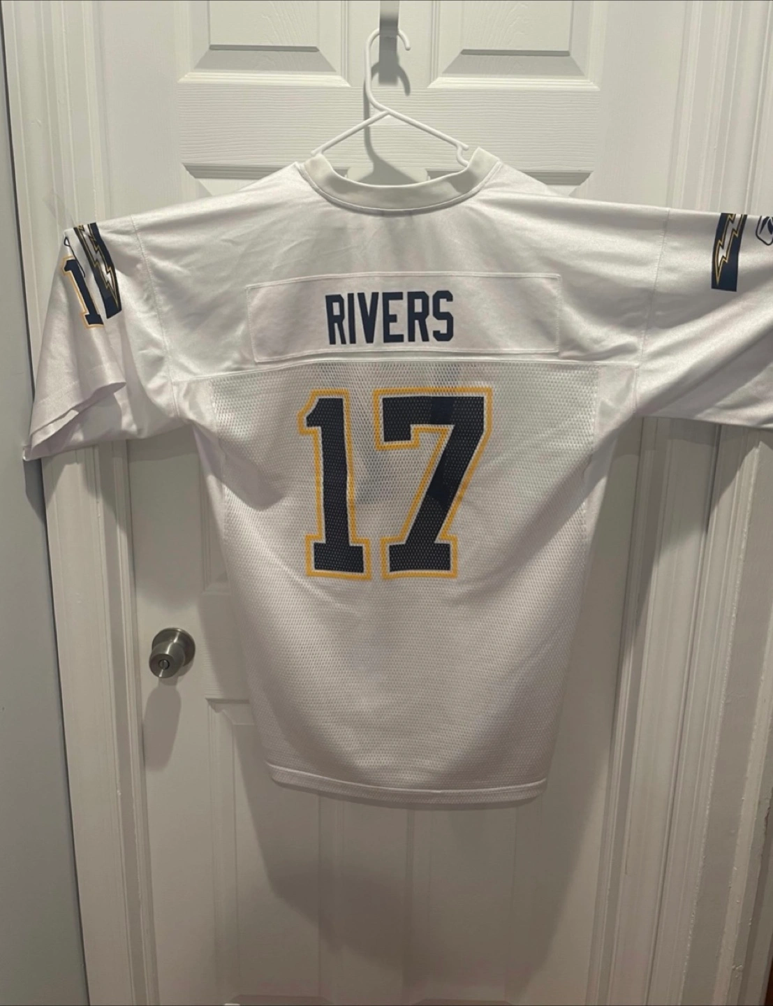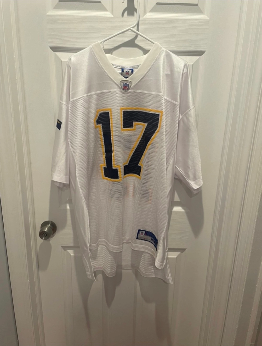 The product is a Reebok Philip Rivers #17 San Diego Chargers jersey in size XL. This NFL football jersey is designed for men and features the classic white color of the team's uniform. Perfect for any football fan looking to show their support for the San Diego Chargers and one of their legendary players, Philip Rivers