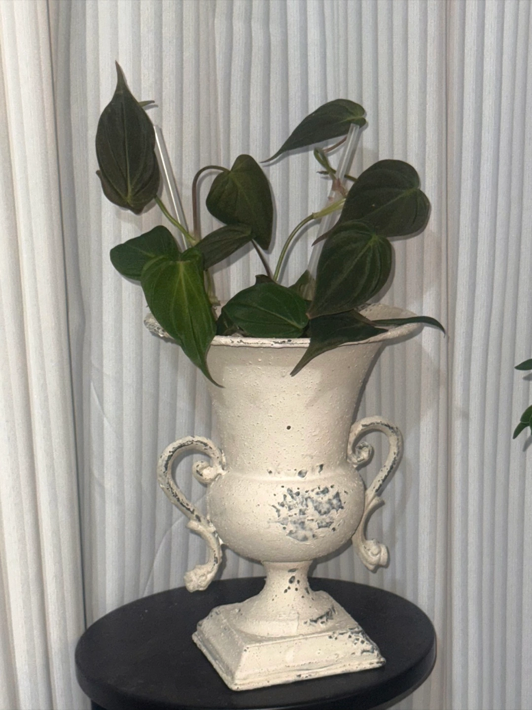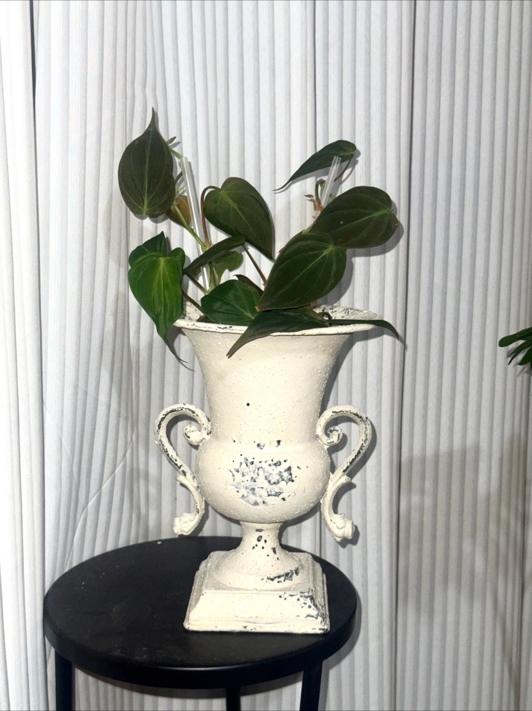 117Philodendron Micans potted in a lovely white decorative iron urn planter! It's a charming piece that adds a touch of elegance to any space. Perfect for displaying. The velvet leaves could be a good upgrade of hanging plants in your room. It's in great condition and ready to find a new home.