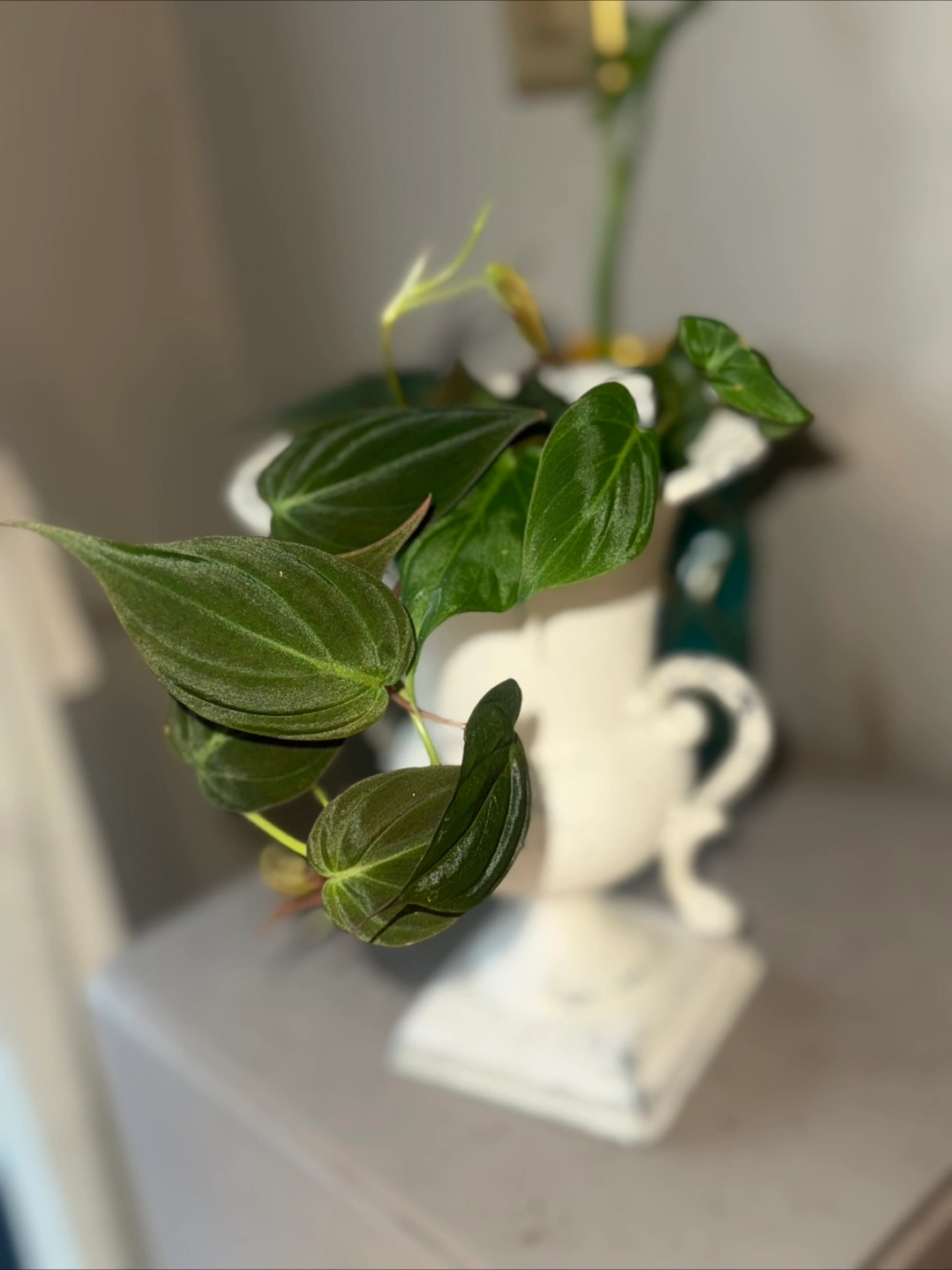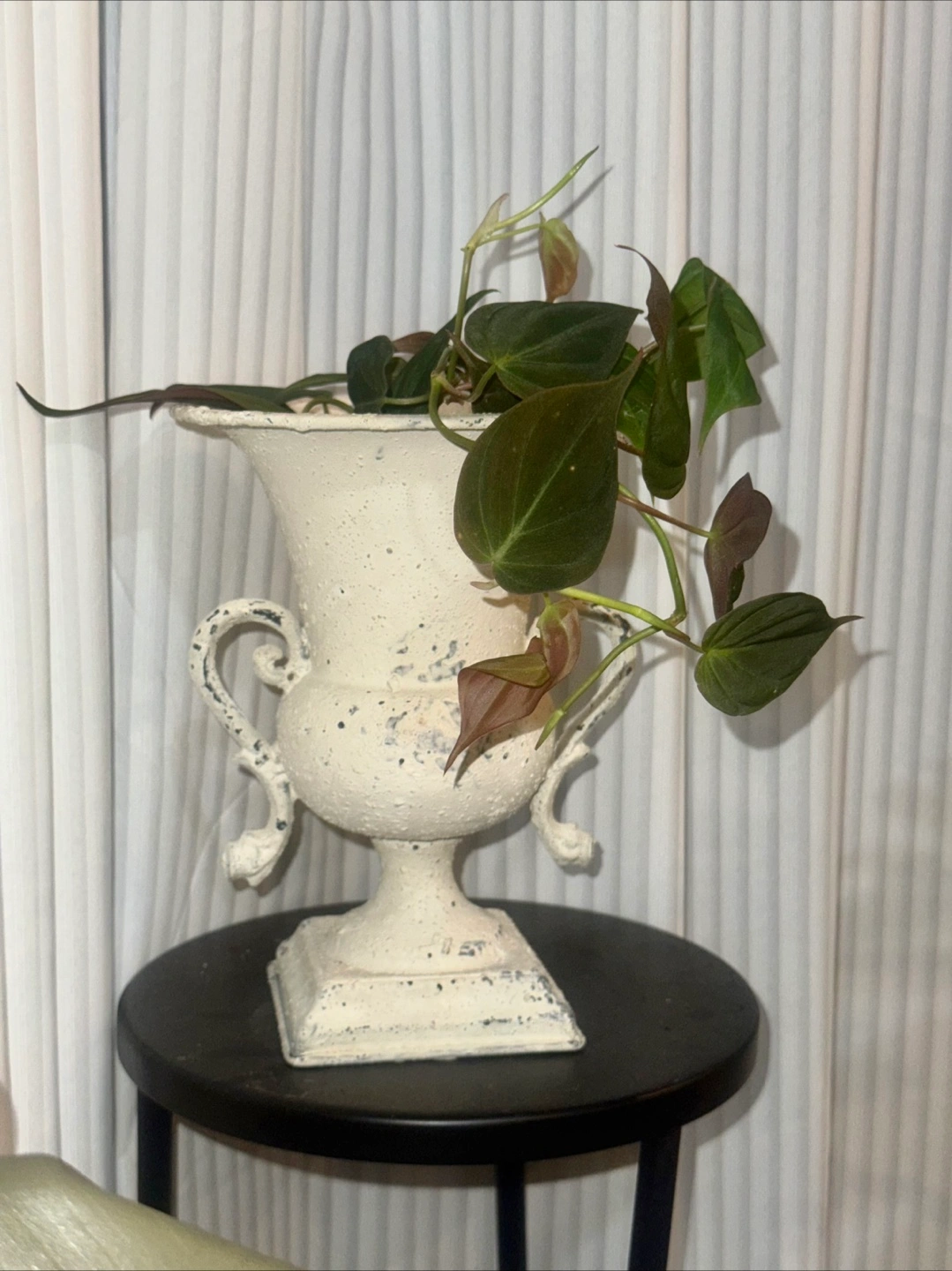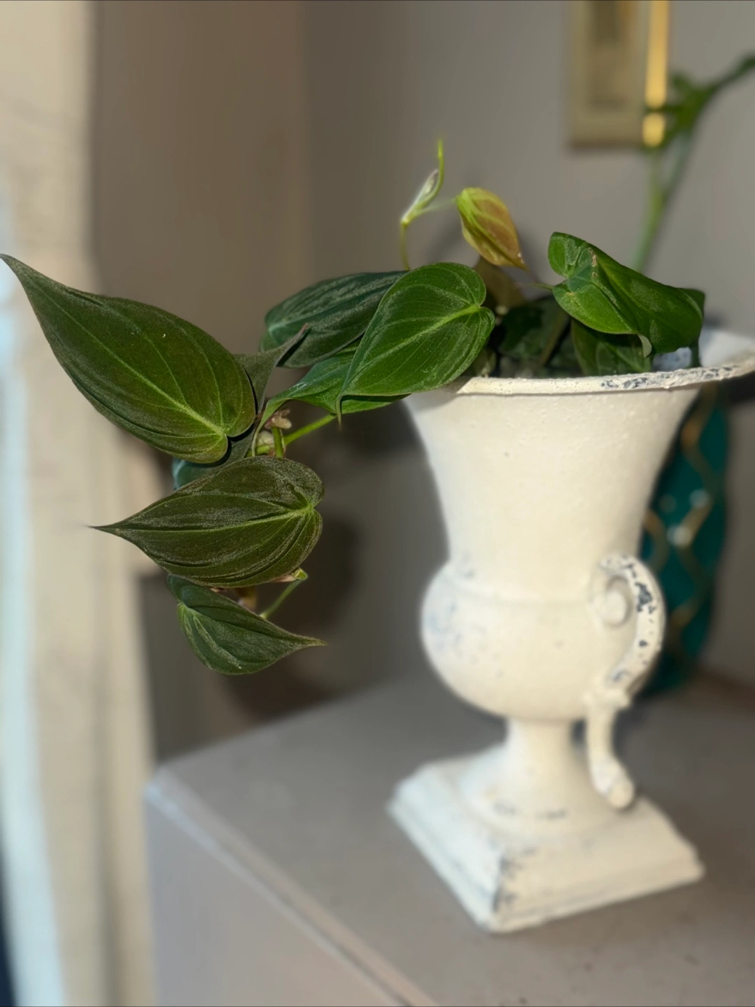 114Philodendron Micans potted in a lovely white decorative iron urn planter! It's a charming piece that adds a touch of elegance to any space. Perfect for displaying. The velvet leaves could be a good upgrade of hanging plants in your room. It's in great condition and ready to find a new home.