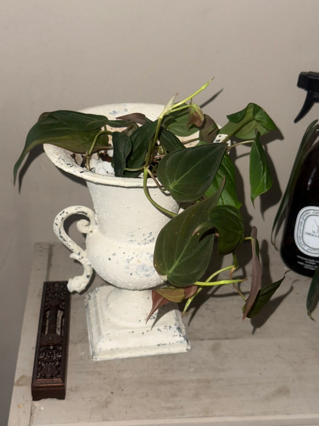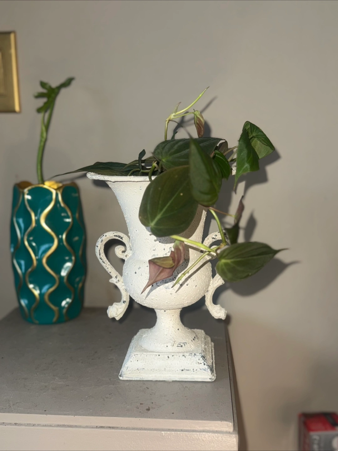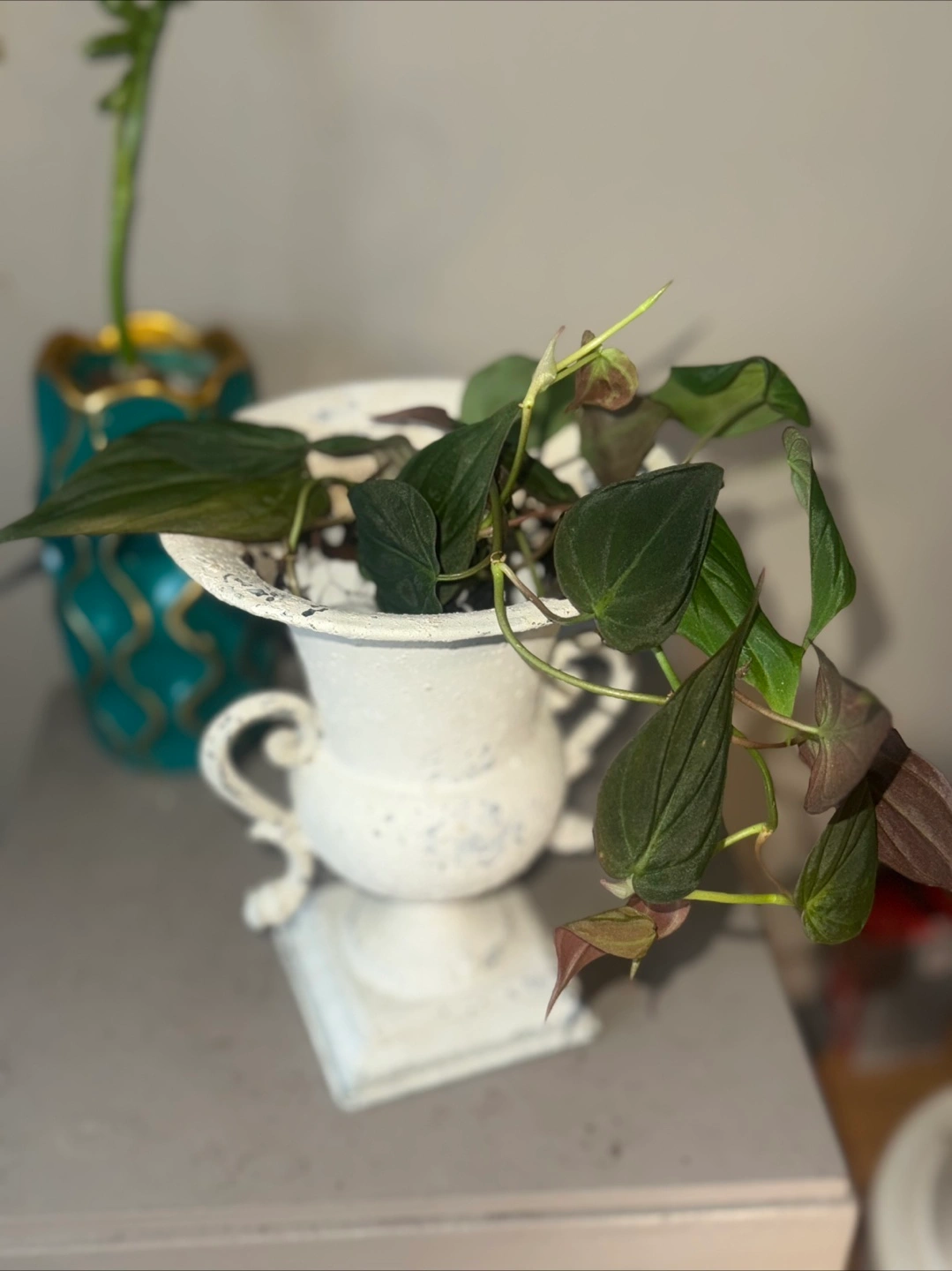 114Philodendron Micans potted in a lovely white decorative iron urn planter! It's a charming piece that adds a touch of elegance to any space. Perfect for displaying. The velvet leaves could be a good upgrade of hanging plants in your room. It's in great condition and ready to find a new home.