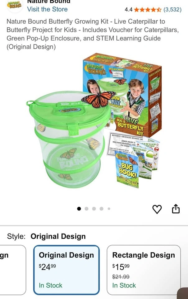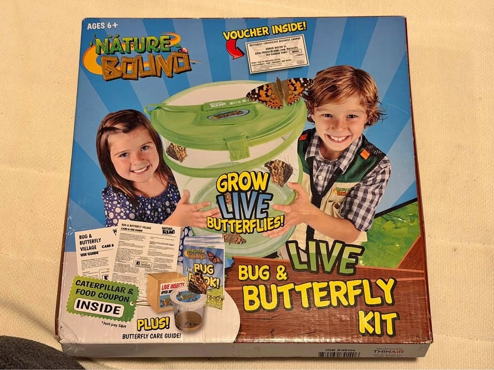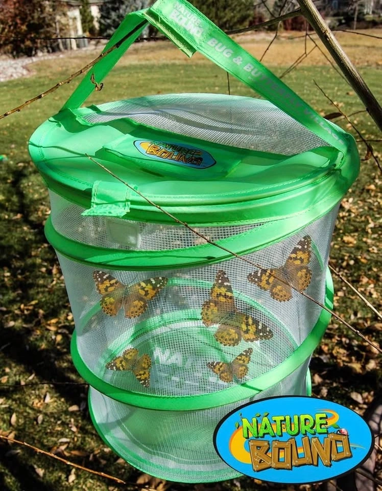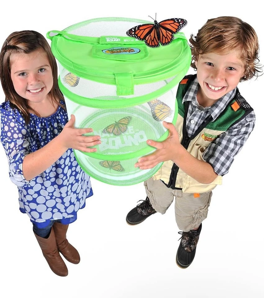 Exciting Nature Bound Live Butterfly Growing Kit for kids! This cool kit has everything needed to watch caterpillars turn into butterflies. Kit comes with a green pop-up enclosure and a STEM learning guide. Voucher for caterpillars and food inside box. Great for ages 6+.