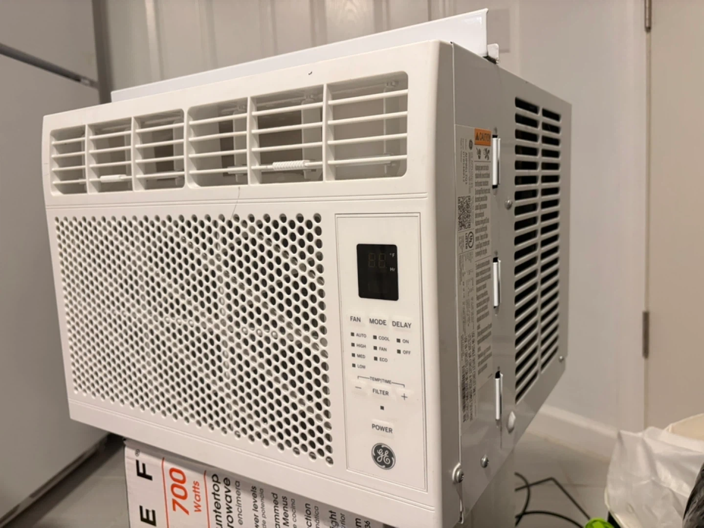 This is a GE window air conditioner, model AHPM06LZ3. It's white and features fan, cool, and delay modes. It's a 5000 BTU unit. Great for a small room!
