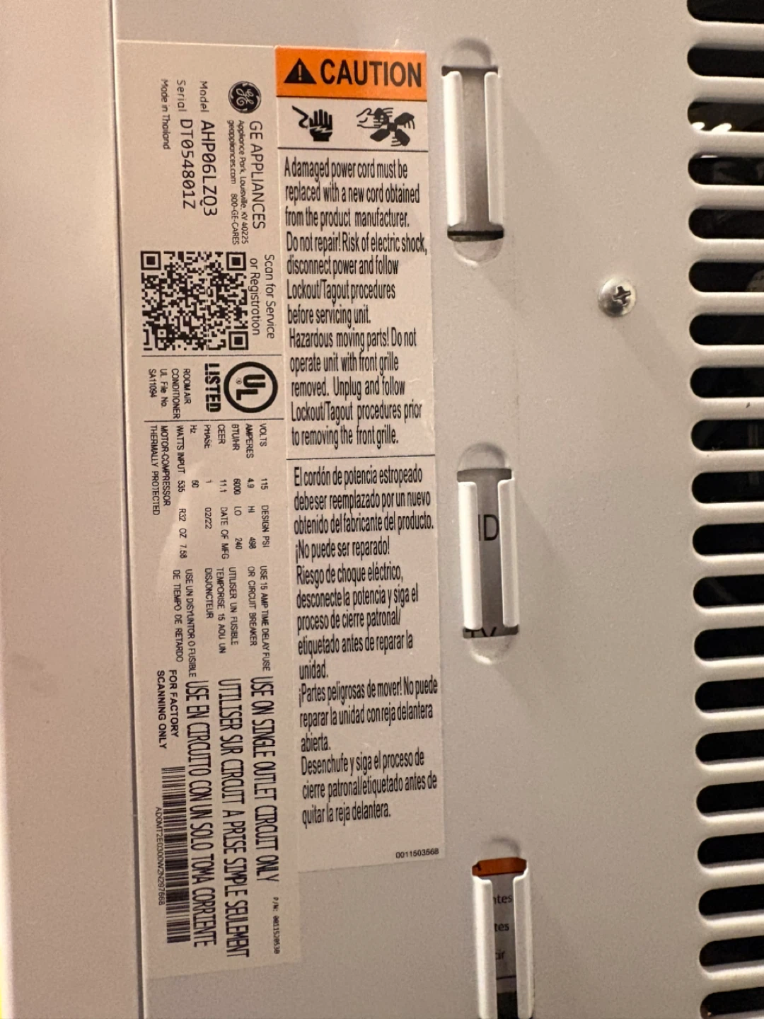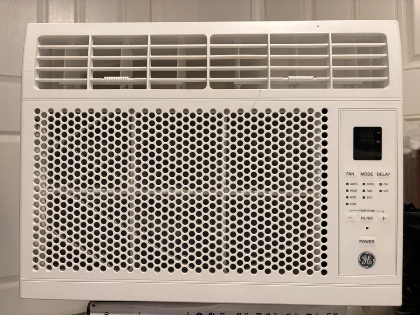 This is a GE window air conditioner, model AHPM06LZ3. It's white and features fan, cool, and delay modes. It's a 5000 BTU unit. Great for a small room!