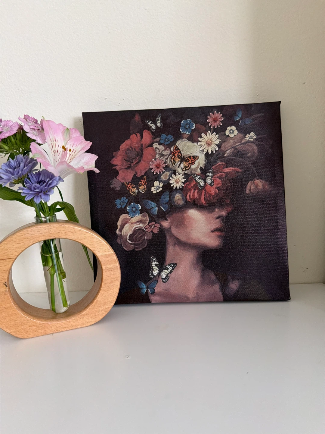 Canvas print featuring a woman adorned with flowers and butterflies. It's a square format artwork. This piece adds a touch of artistic flair to any room!