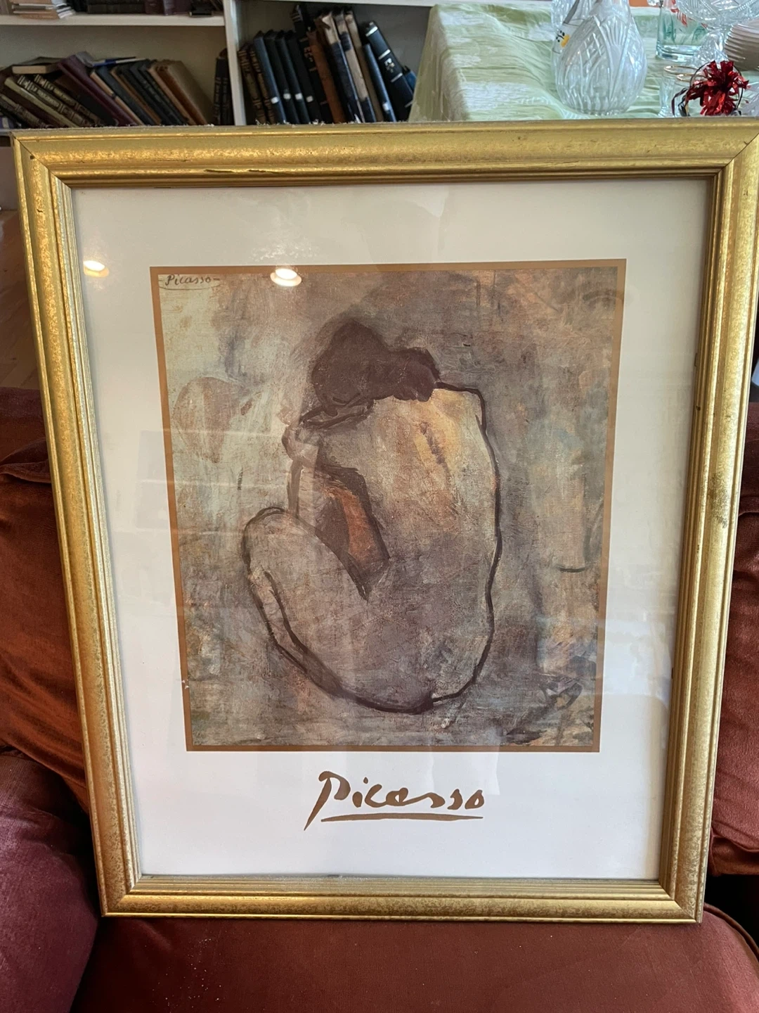 70Selling a framed print of a Picasso piece. The frame is gold-colored and in good condition. It would look great in any room! 12x13.5