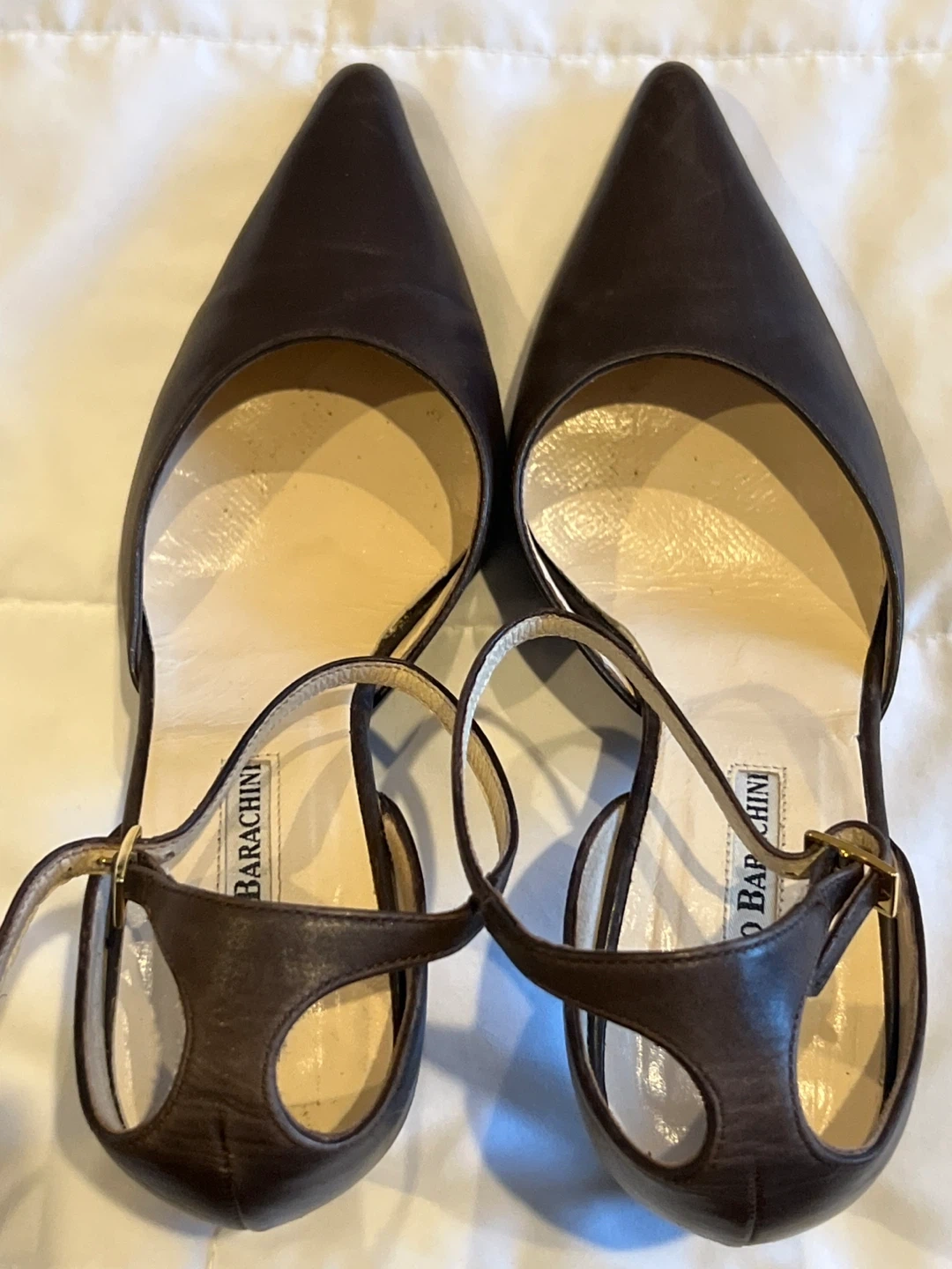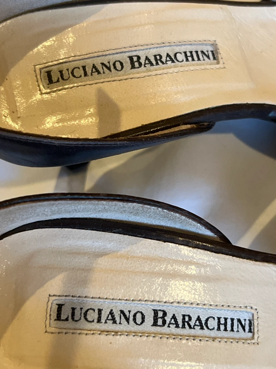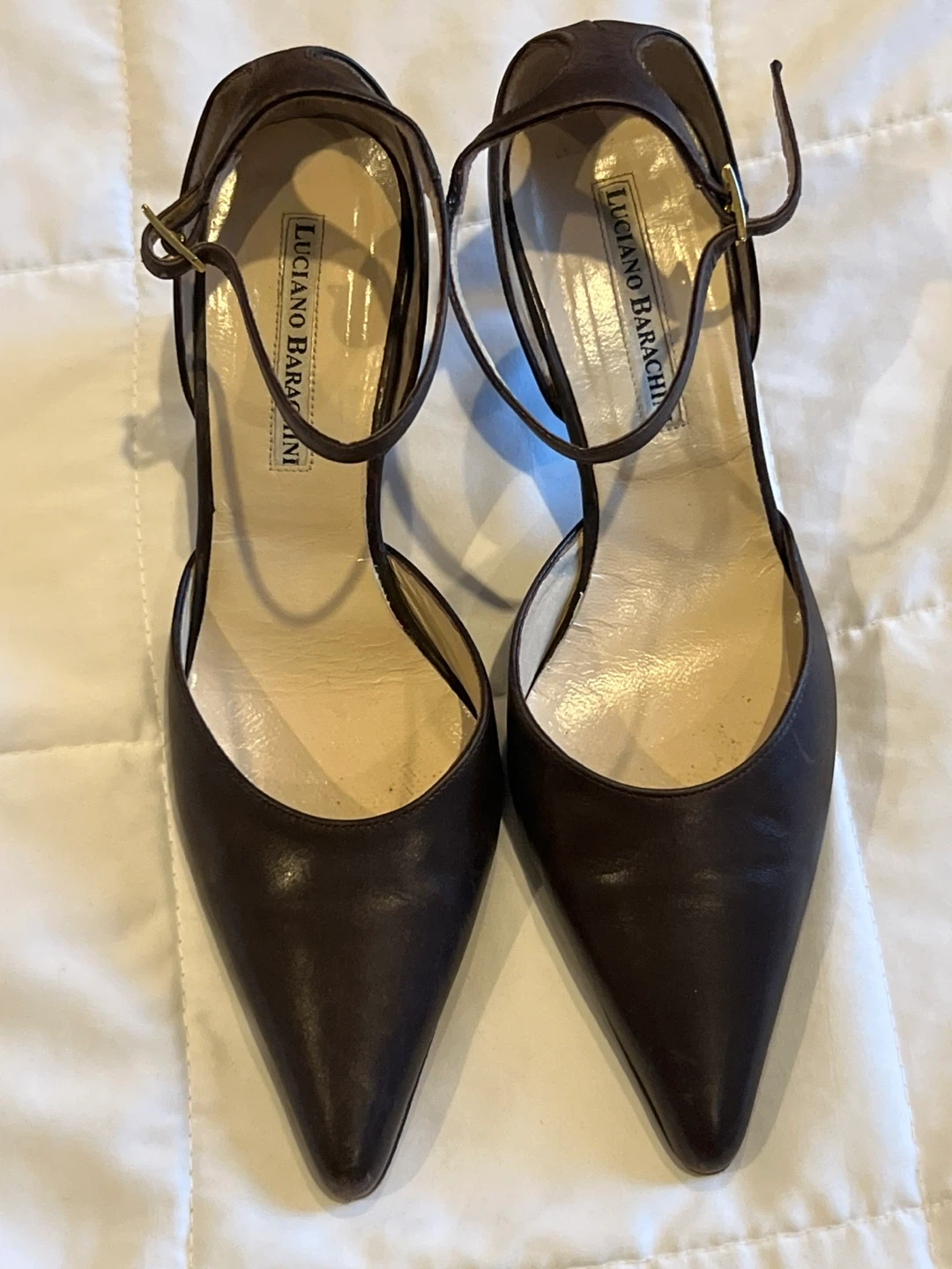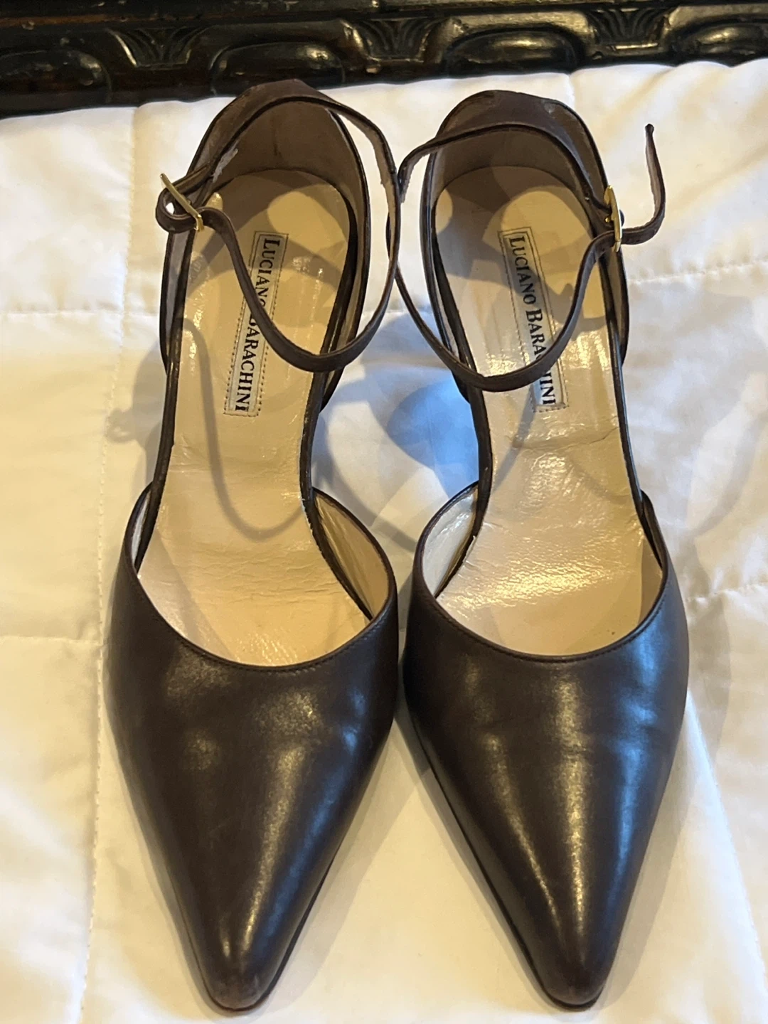 Brown leather heels from Luciano Barachini. Features a pointed toe and ankle strap detail. Made in Italy. Heel height approx. 3 inches.