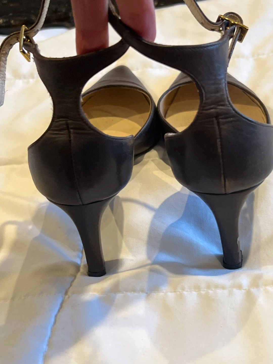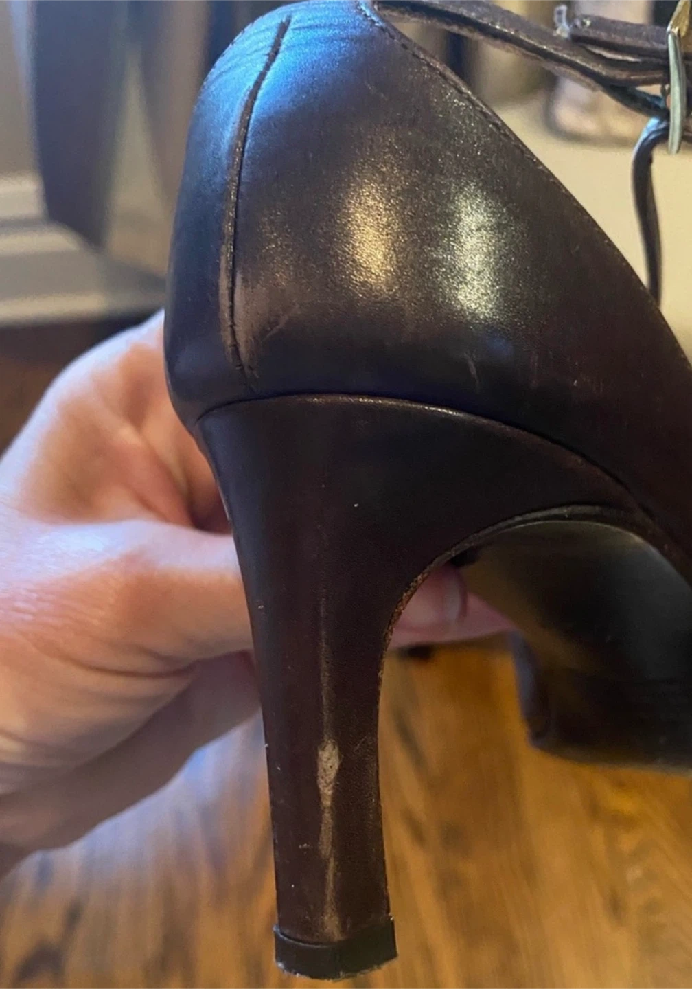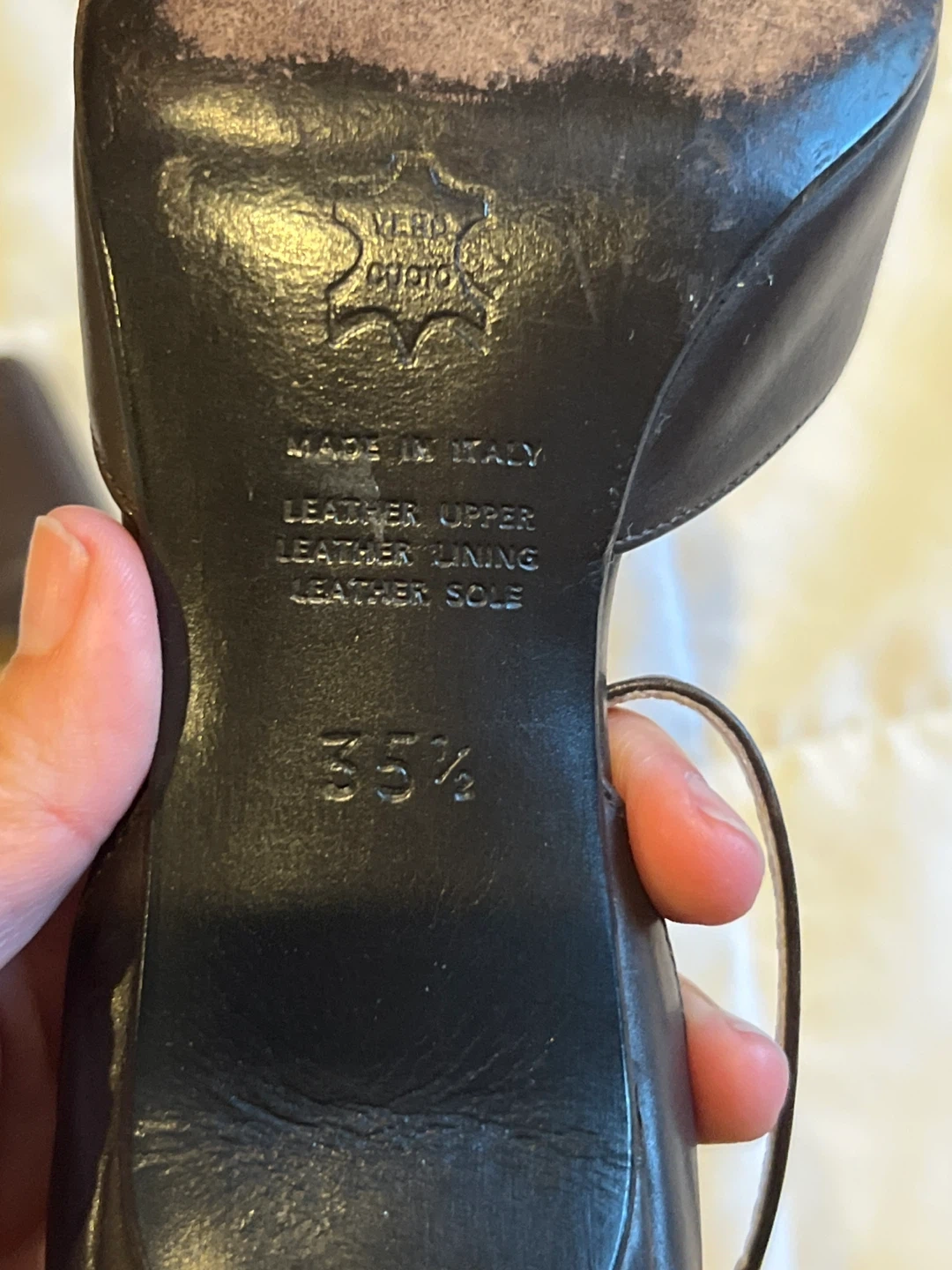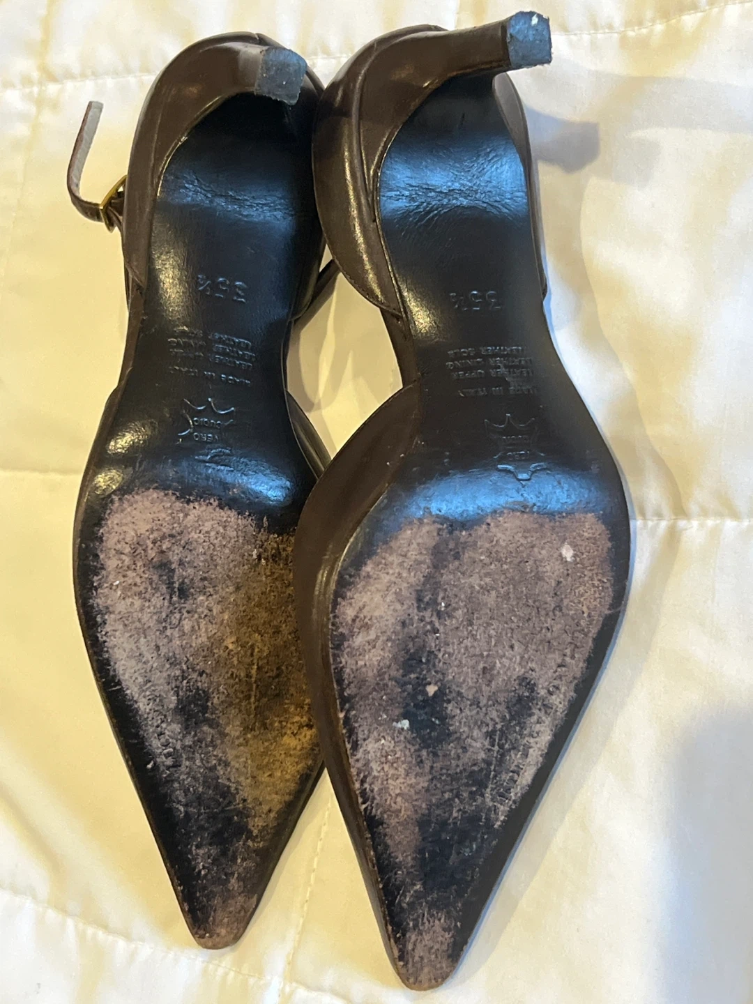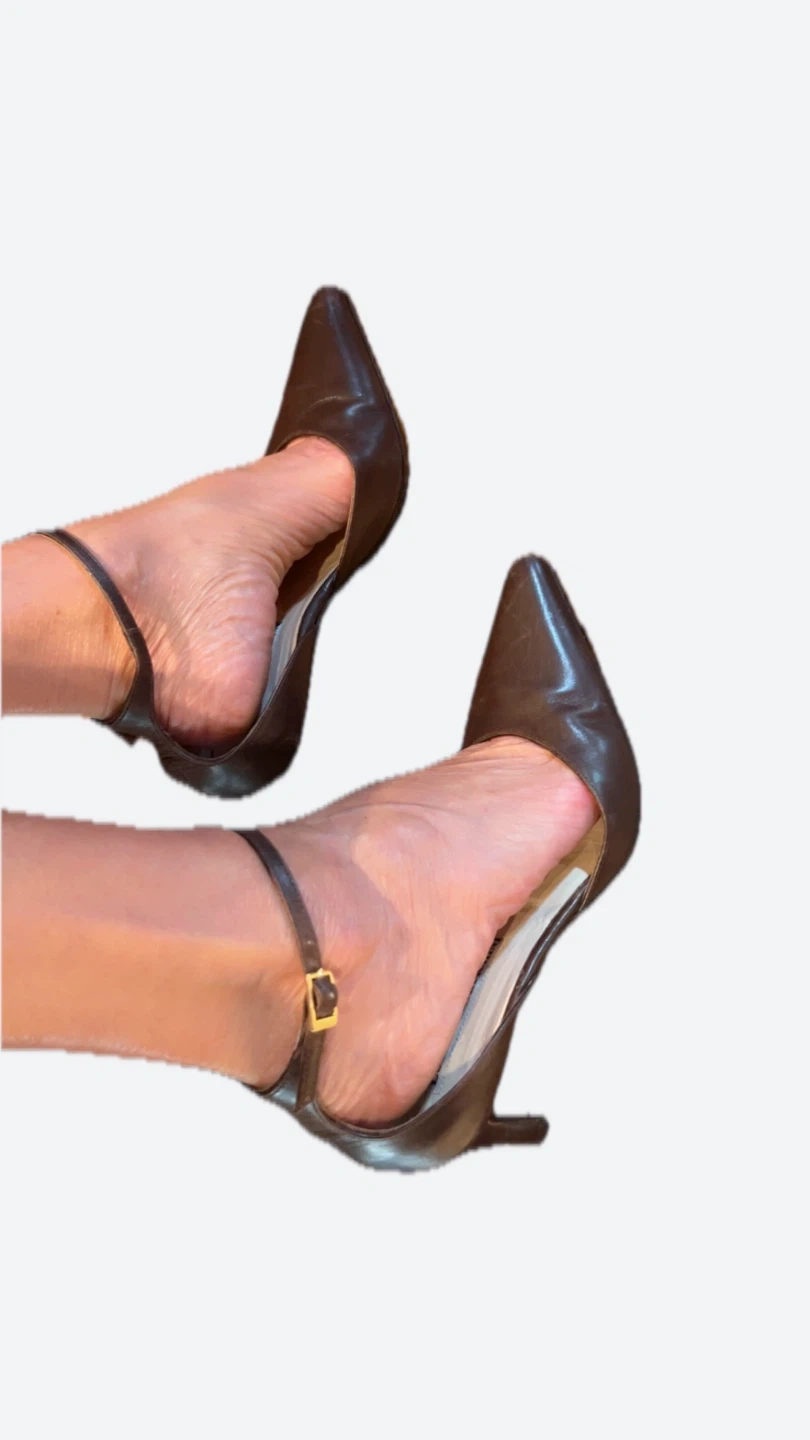 Brown leather heels from Luciano Barachini. Features a pointed toe and ankle strap detail. Made in Italy. Heel height approx. 3 inches.