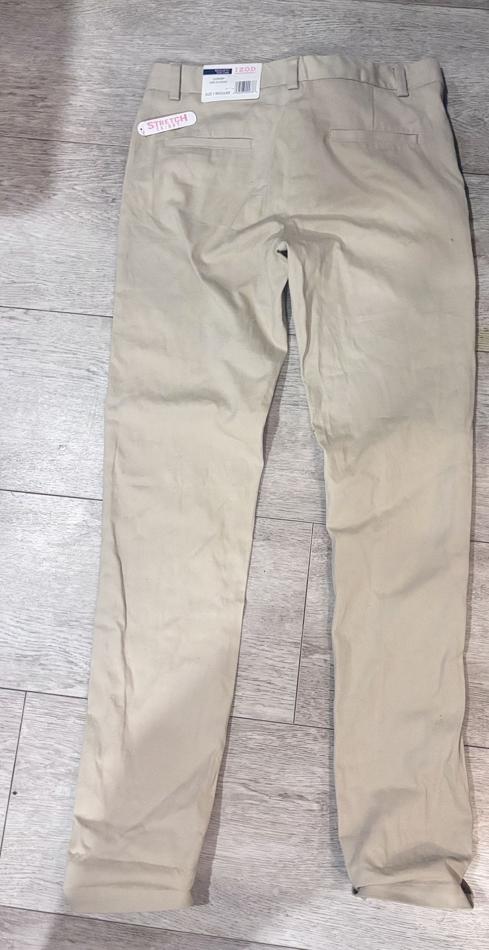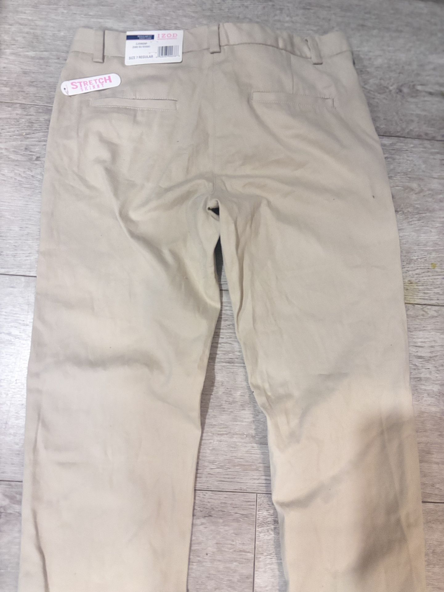 Brand new IZOD Approved Schoolwear khaki pants in Size 7 Regular. Features a stretch skinny fit that’s comfortable, flexible, and polished—perfect for school uniforms or everyday wear. Measures 14 1/2 waist and 39 inches in length. Made with easy-care fabric designed for durability and all-day comfort. Neutral khaki color pairs easily with uniform tops and shoes. Never worn, still has original tags attached. Brand: IZOD, Size: 7 Regular, Color: Khaki, Fit: Stretch Skinny, Condition: New with tags, School uniform approved, Easy care / wrinkle-resistant.