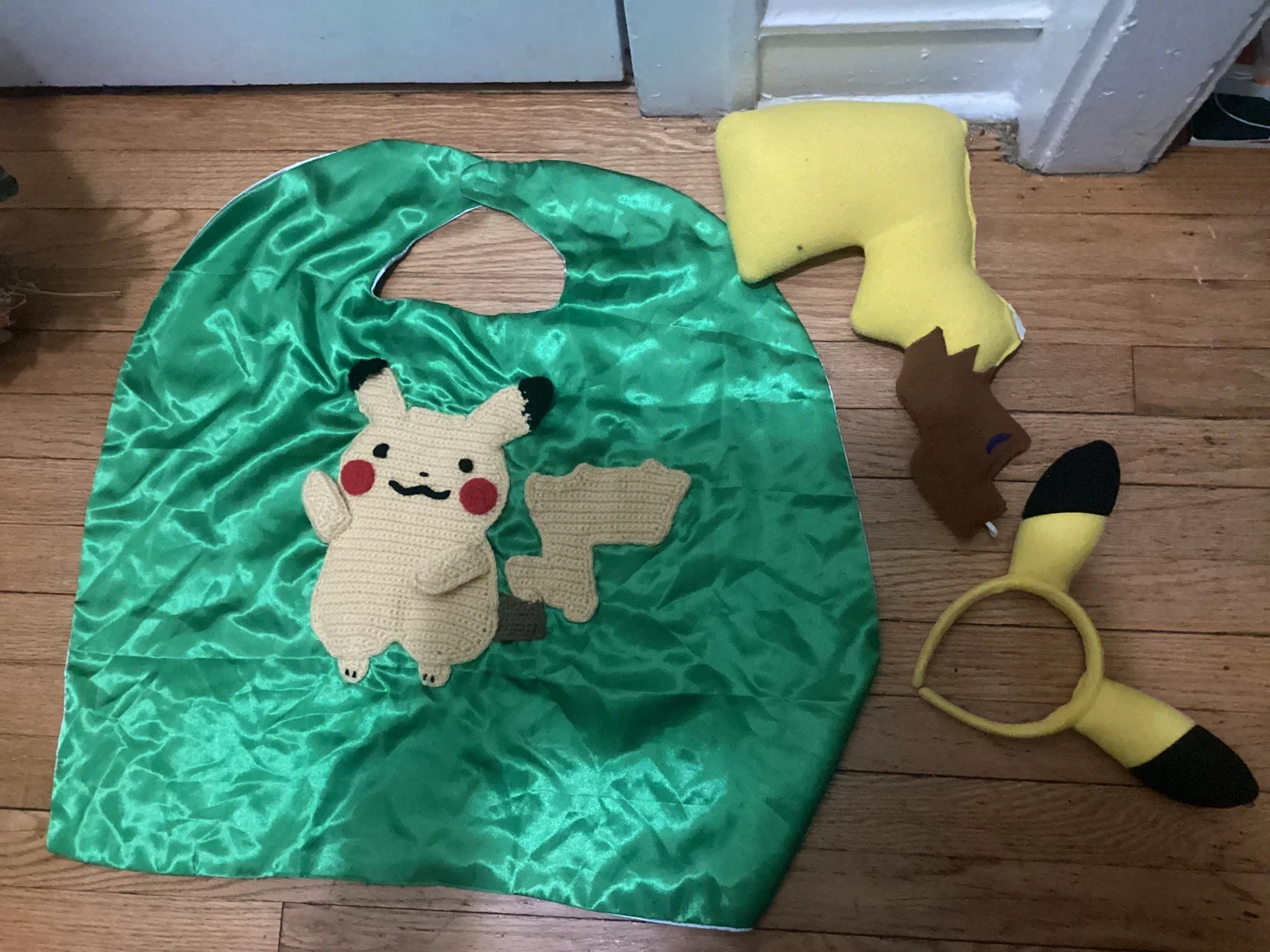 Get ready to catch 'em all with this adorable Pikachu costume set! It comes with a green cape featuring a crocheted Pikachu, a tail, and a Pikachu ear headband. Perfect for dress-up or Halloween!
