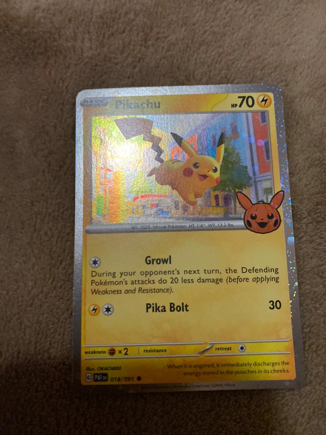 10Selling a Pikachu Pokemon card! It has a 'Growl' ability and a 'Pika Bolt' attack. The card's HP is 70. It also shows a weakness of x2.