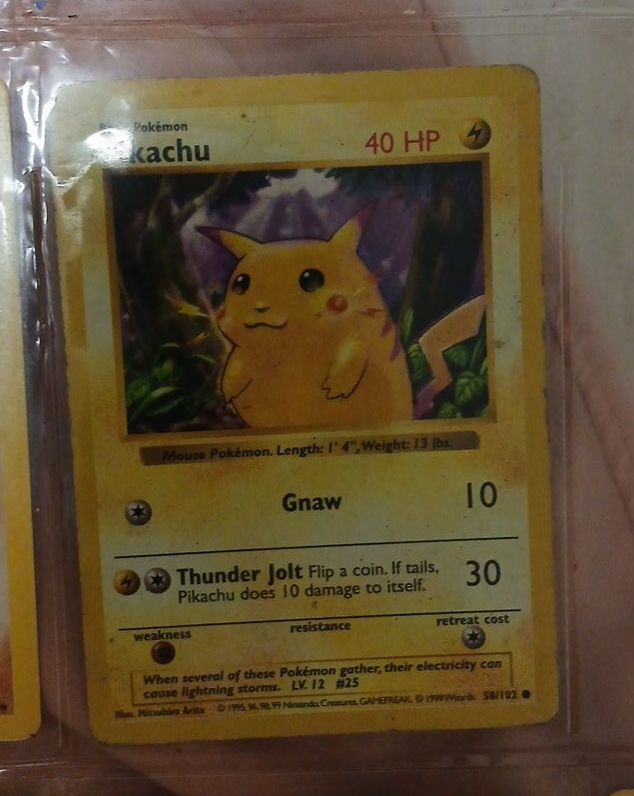 Selling a Pikachu Pokemon trading card. The card features Pikachu, a Mouse Pokemon, with a length of 1' 4" and weight of 13 lbs. It has attacks like Gnaw and Thunder Jolt. Card number is 58/102