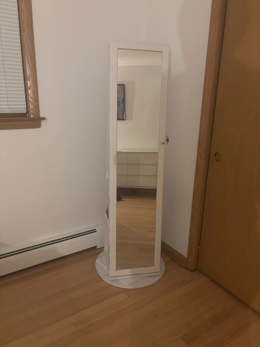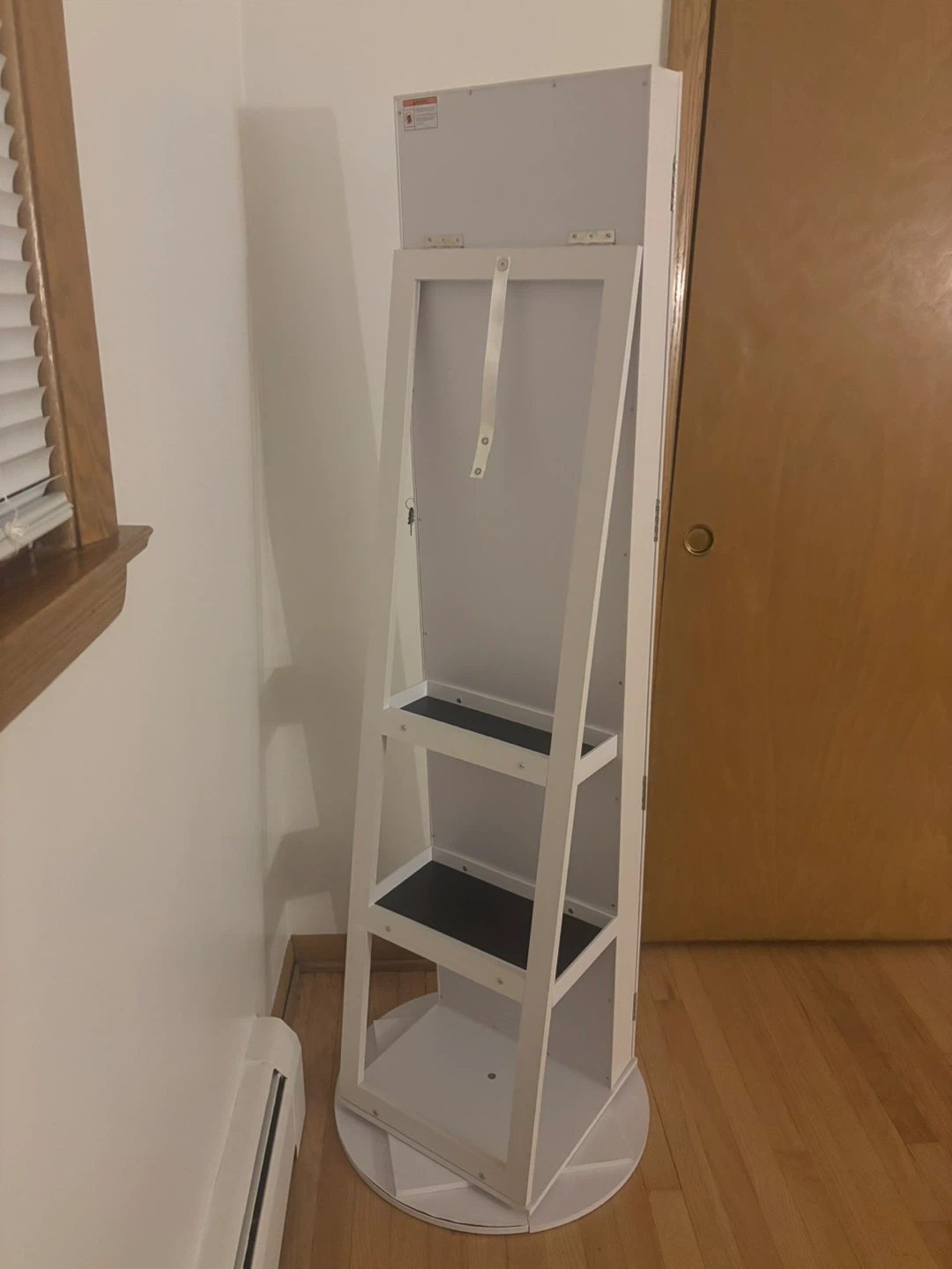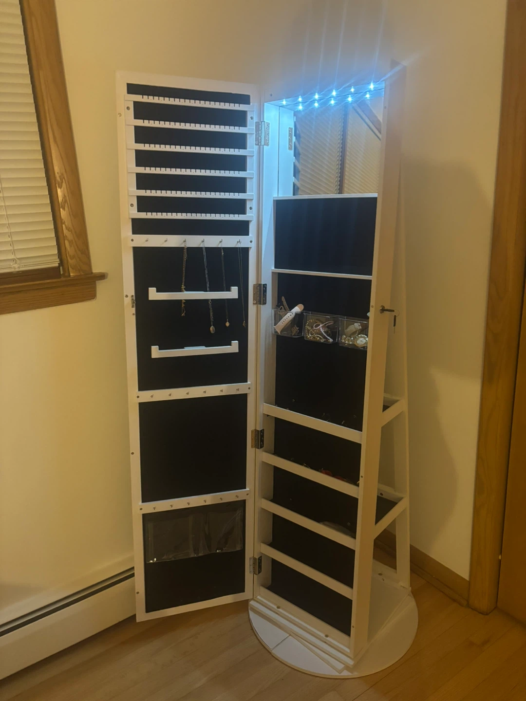 Selling a rotating jewelry cabinet with a mirror! It has a white finish and features storage shelves and interior lighting. Perfect for organizing your jewelry and accessories
