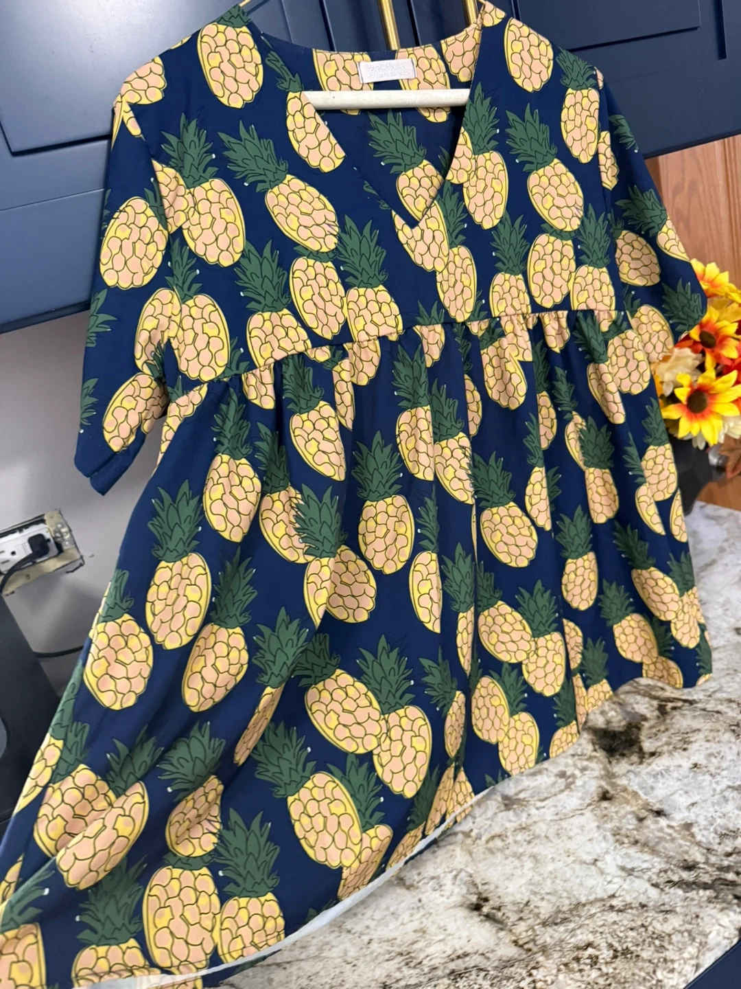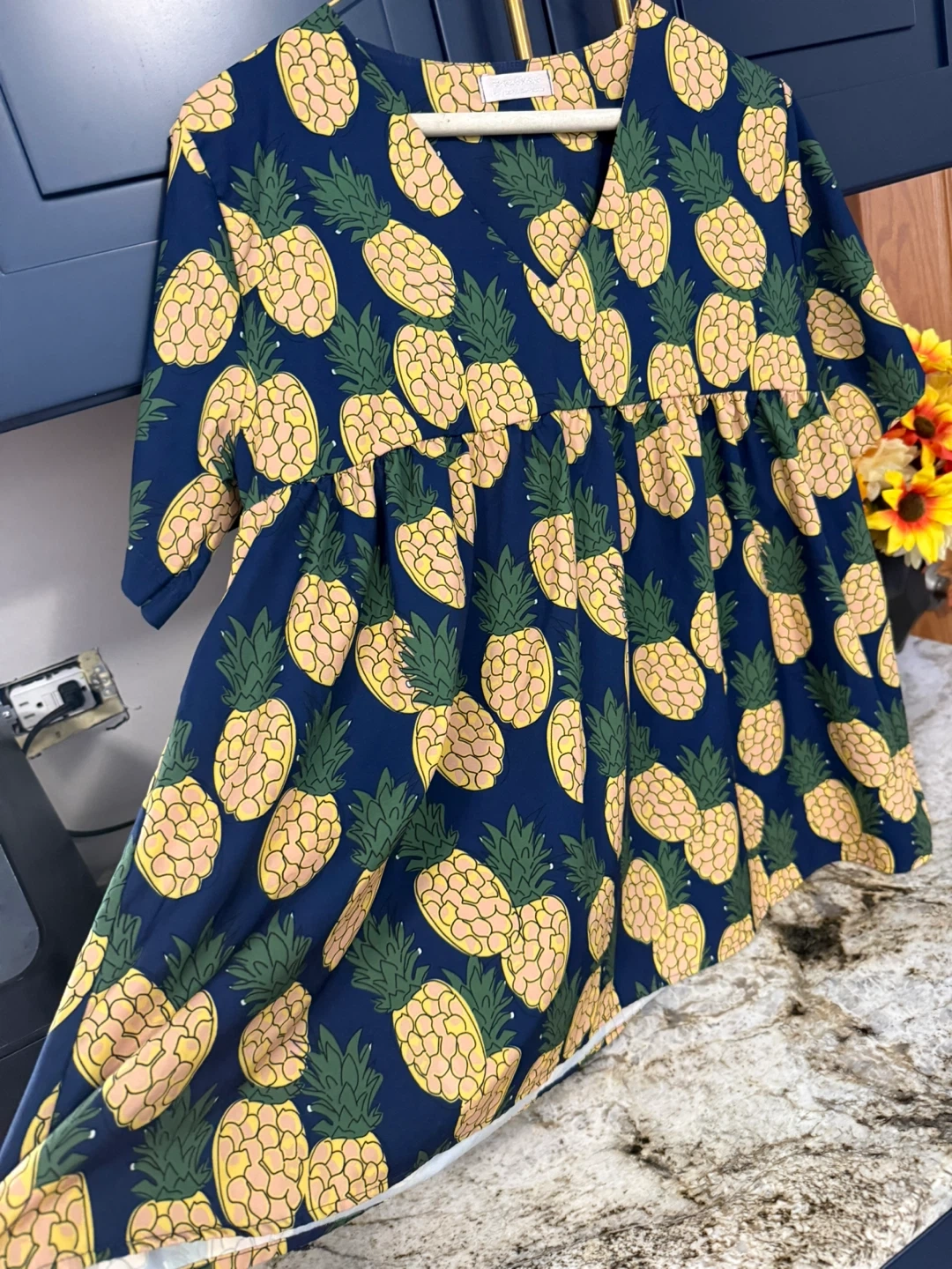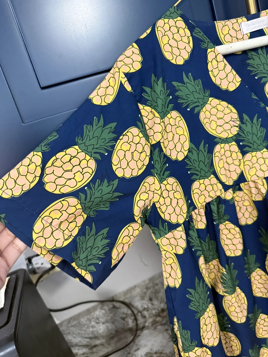 Like new good condition clean only use one time This is a cute dress with a fun pineapple print! It has a v-neck and short sleeves. The dress is in great condition and ready for a new home