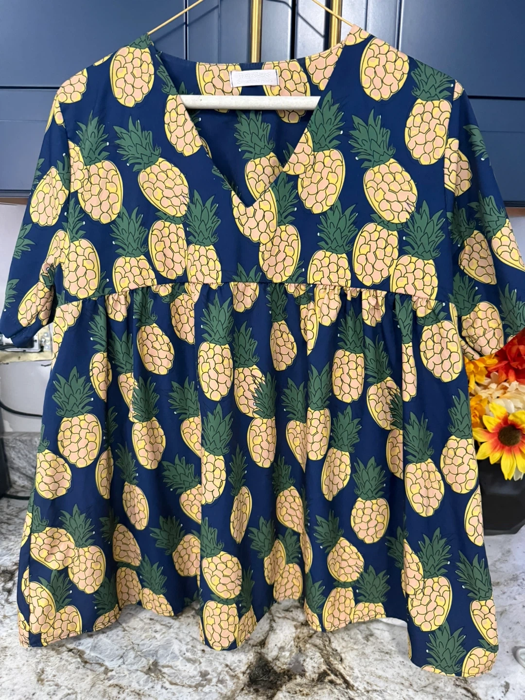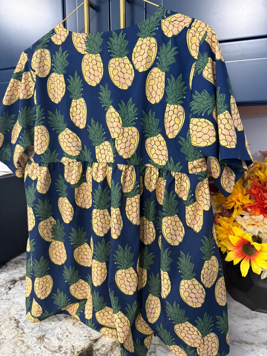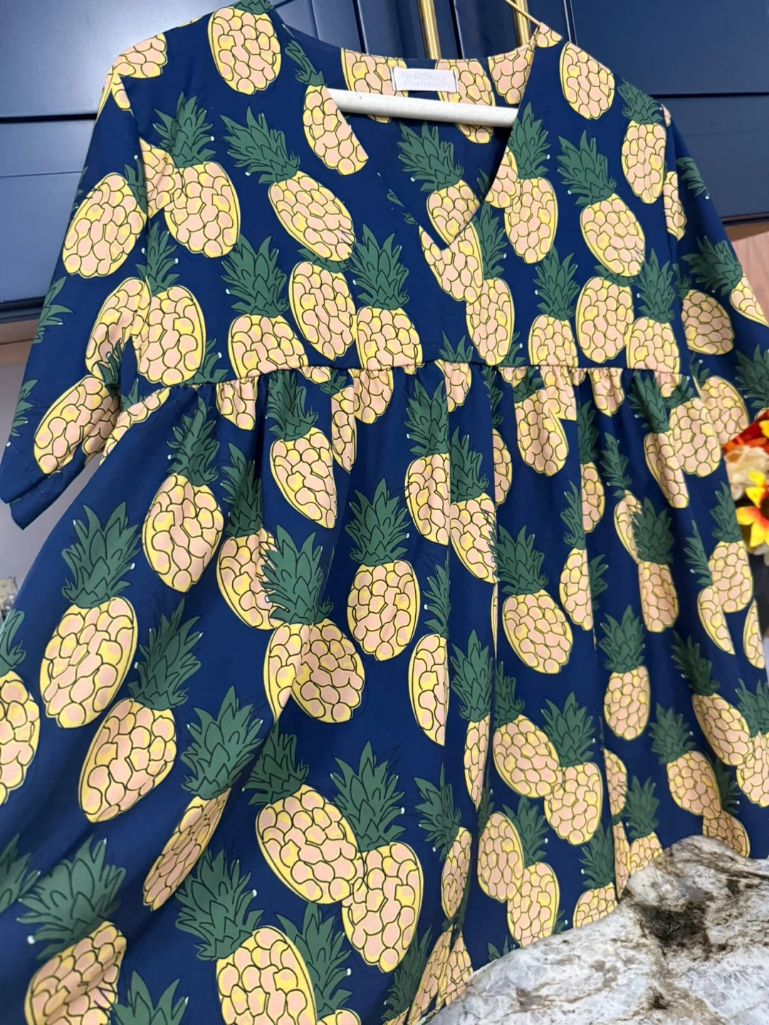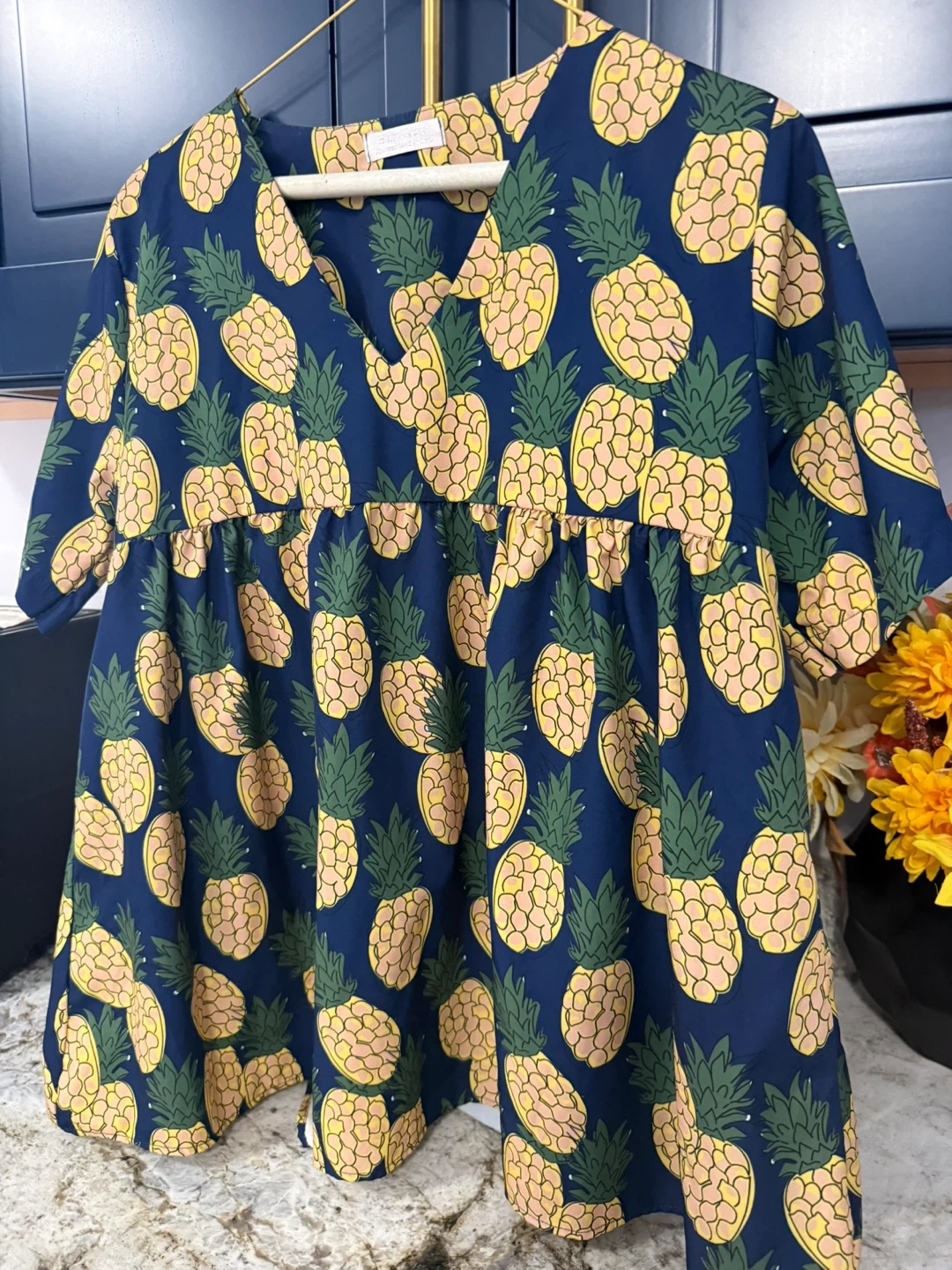 Like new good condition clean only use one time This is a cute dress with a fun pineapple print! It has a v-neck and short sleeves. The dress is in great condition and ready for a new home