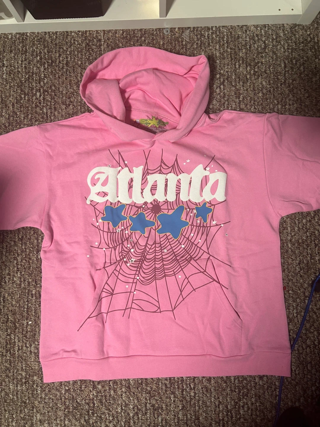 Selling a pink SP5DER hoodie with an Atlanta design, no trades