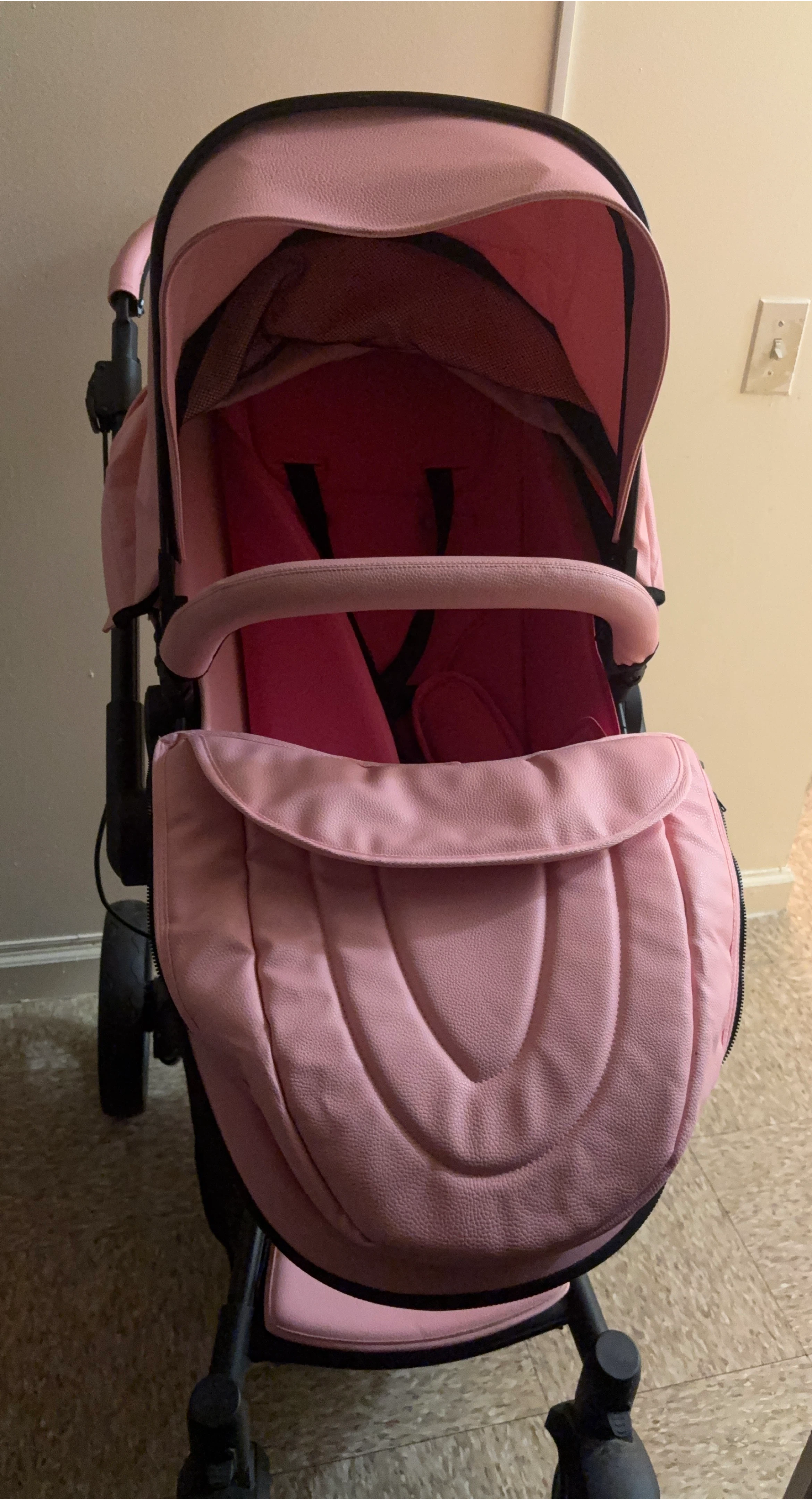 Selling a baby stroller in pink. It's in good condition and ready for a new home! Perfect for strolls around the neighborhood or trips to the park