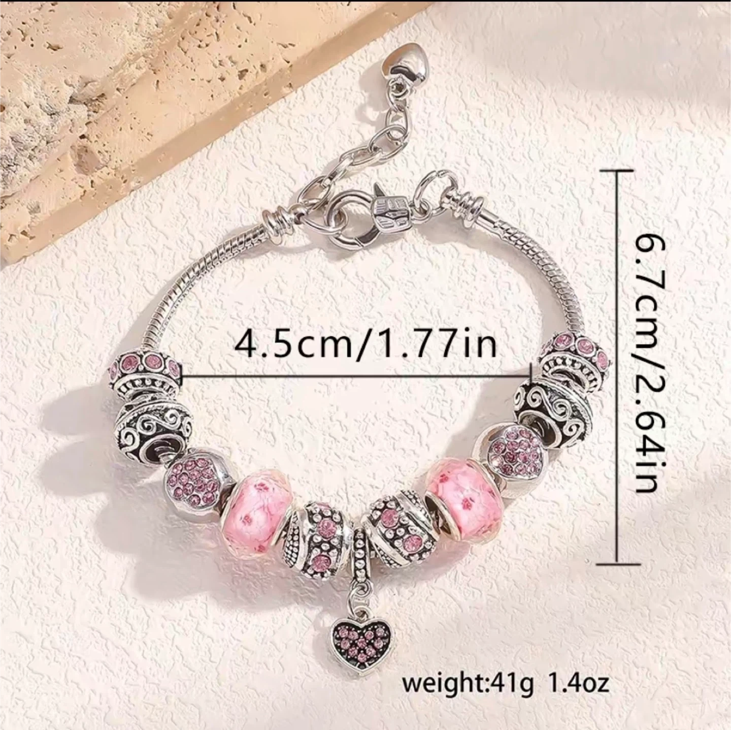 327This is a beautiful pink beaded charm bracelet. It features a variety of beads and a heart-shaped charm. The bracelet is 4.5cm/1.77in in diameter and weighs 41g/1.4oz. It's a lovely accessory to add a touch of charm to any outfit