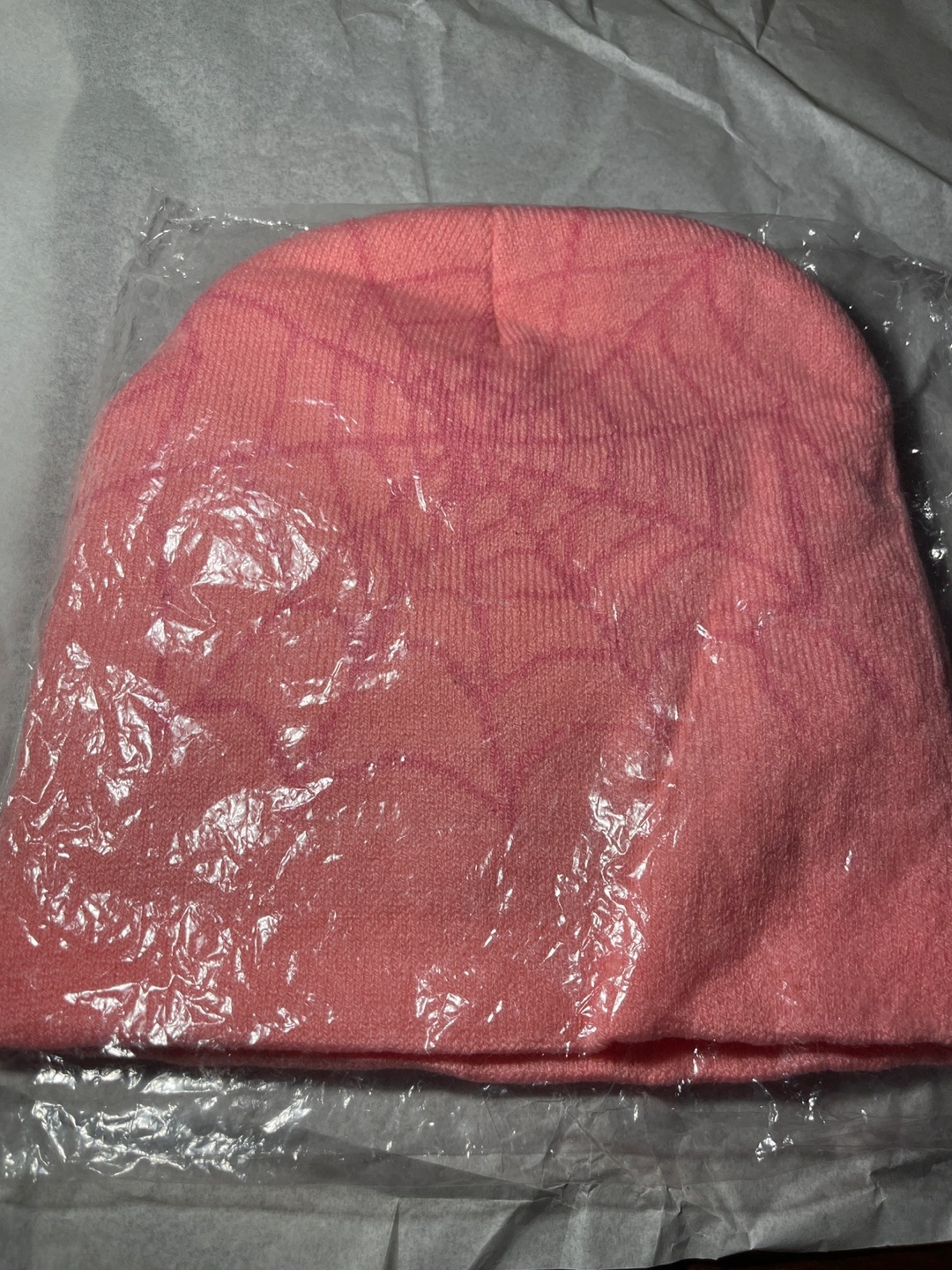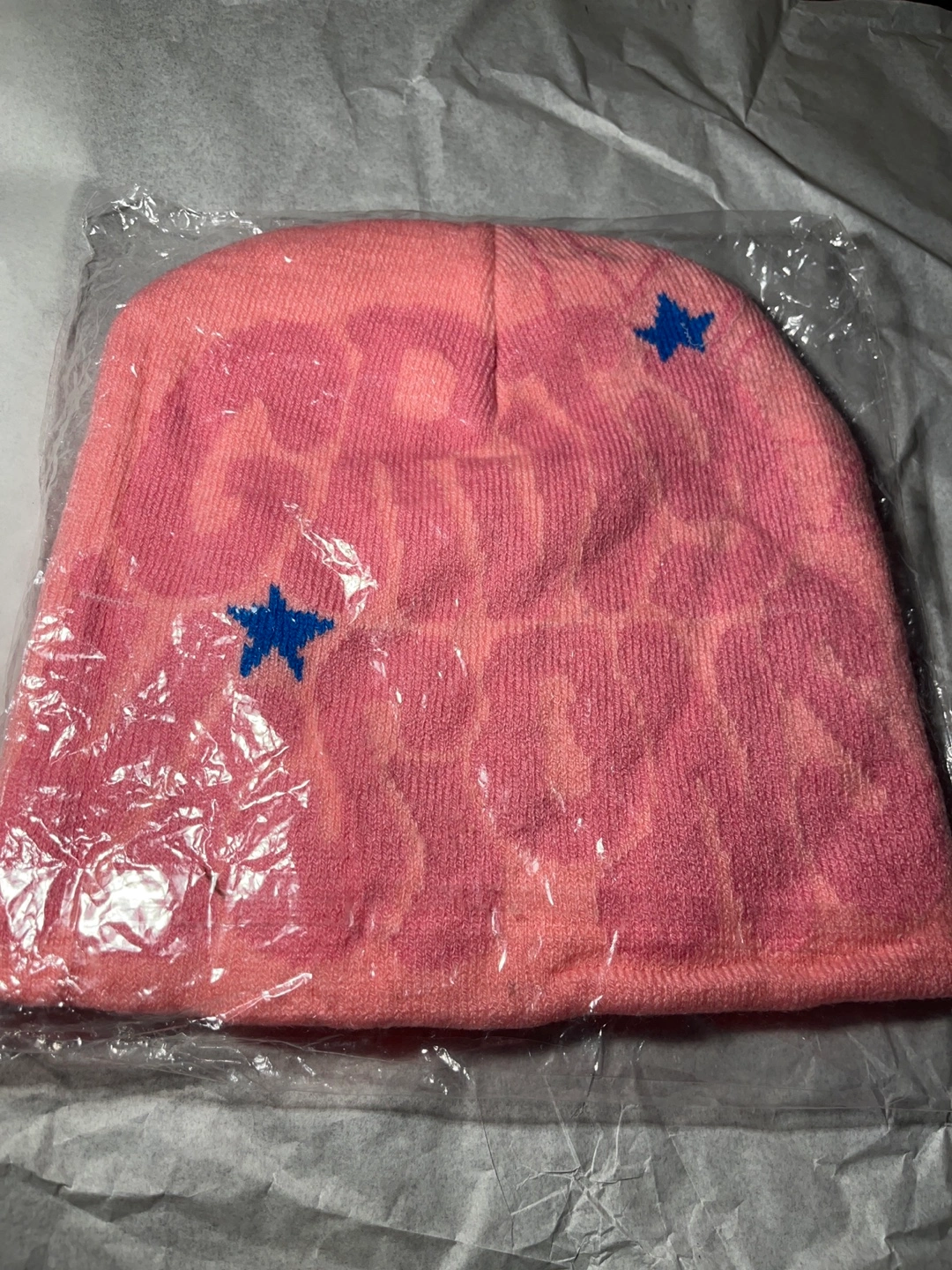 Pink knit beanie. Features blue stars and repeating pattern. New with tags.