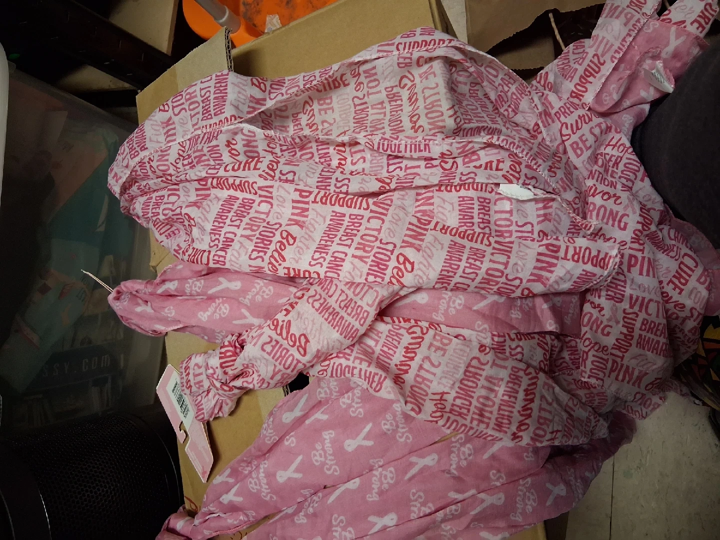 10Selling a pink scarf with breast cancer awareness messages and ribbons. It's in good condition and features various inspiring words related to breast cancer awareness. i have 7 scarves $5 each