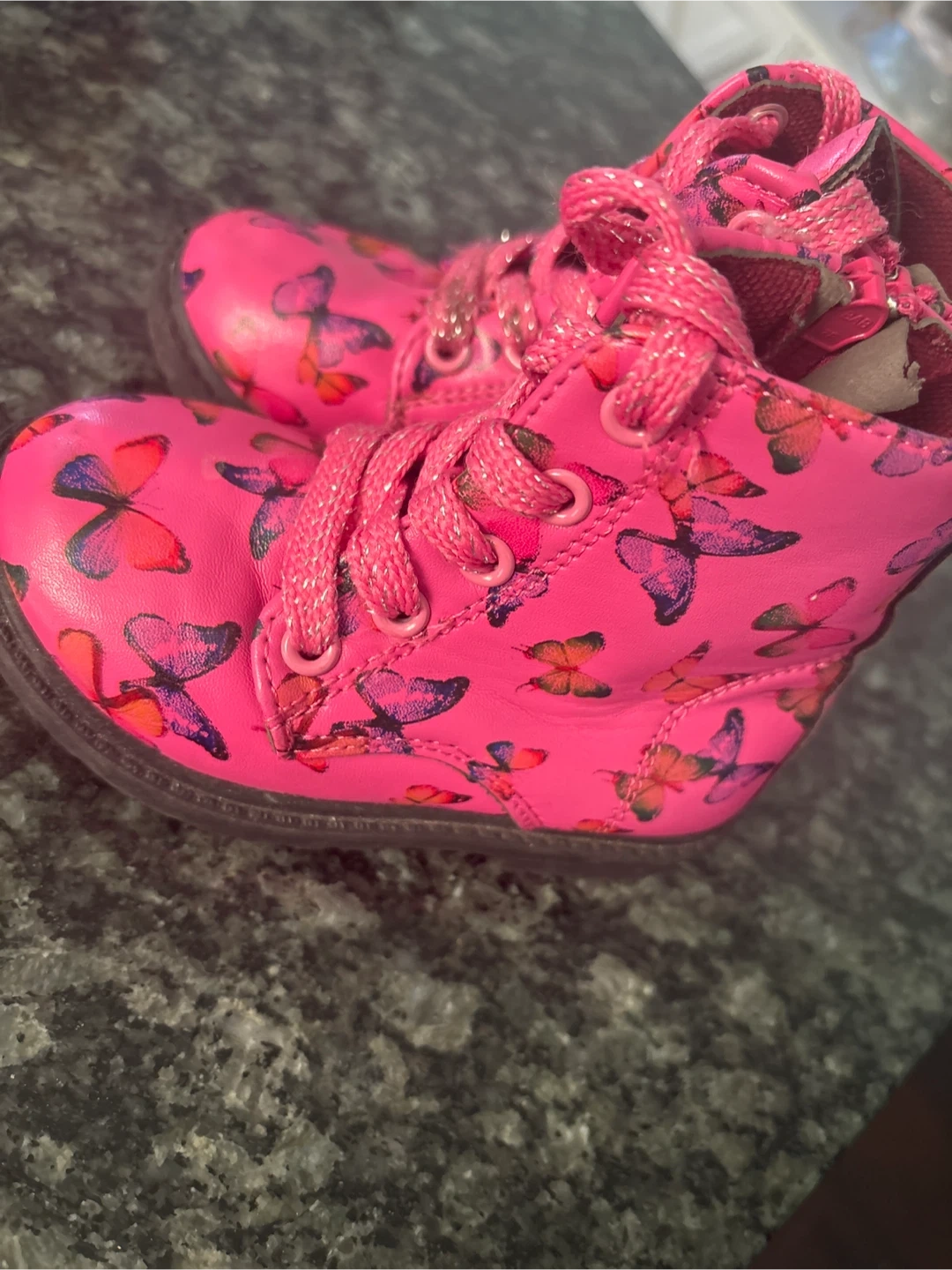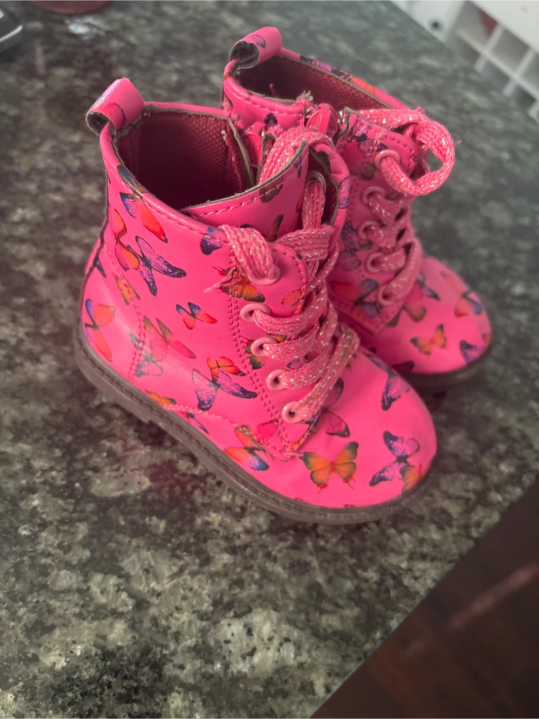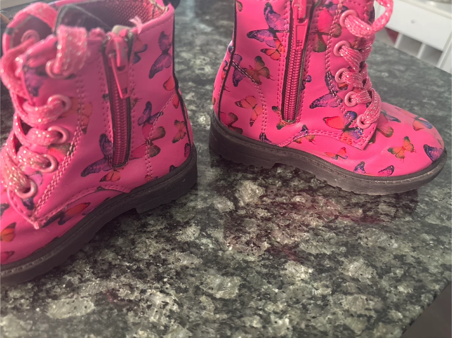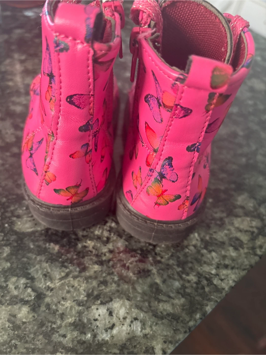 390These cute pink boots feature a fun butterfly design! They have both laces and a zipper for easy wear. Great for any little one who loves to play outside. Size 6c