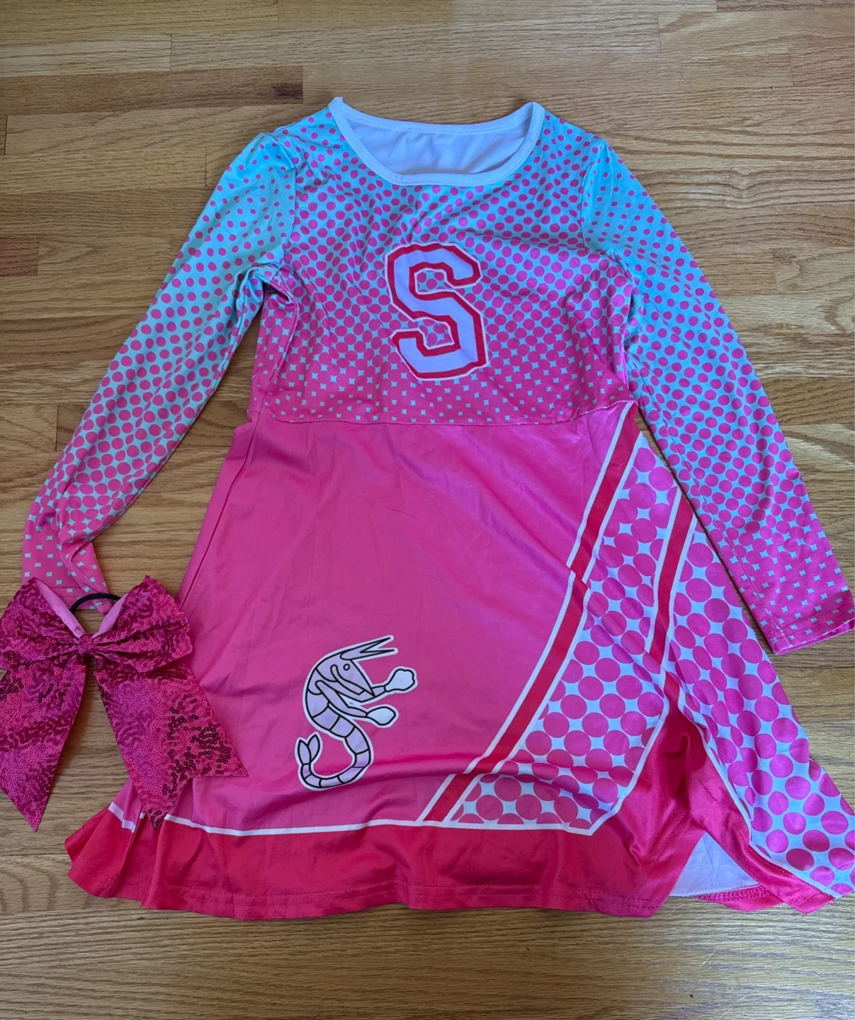 Selling a cute pink cheerleader dress! It features a big 'S' on the front and a fun shrimp design. Comes with a matching hair bow to complete the look