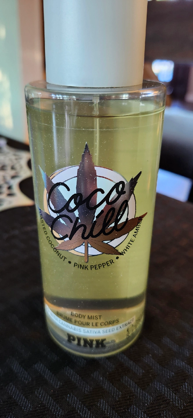 Selling a PINK Coco Chill body mist from Victoria's Secret. It has a woody gourmand scent with notes of toasted coconut, pink pepper, and white amber. It comes in its original box, which says 'Scents that Inspire'