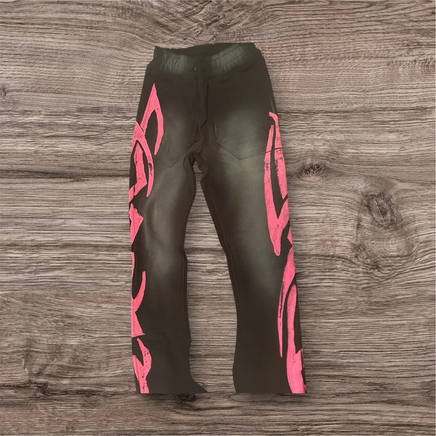 25Cool black pants with a unique pink design on the legs! They have a drawstring waist for a comfortable fit