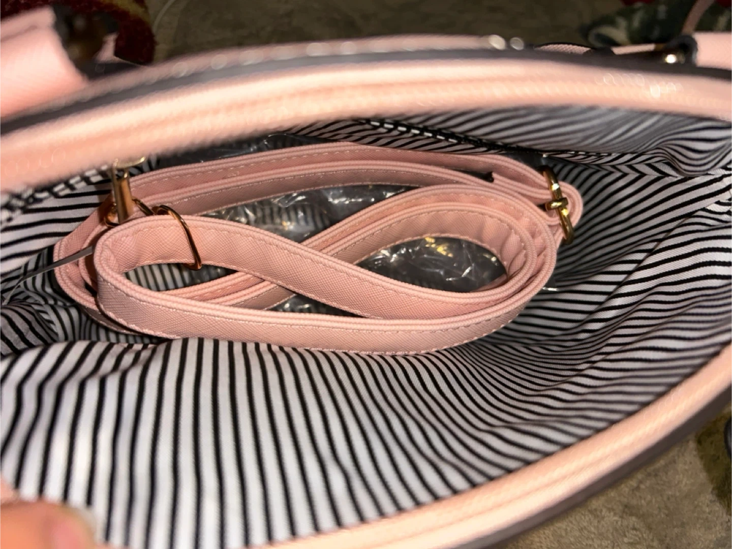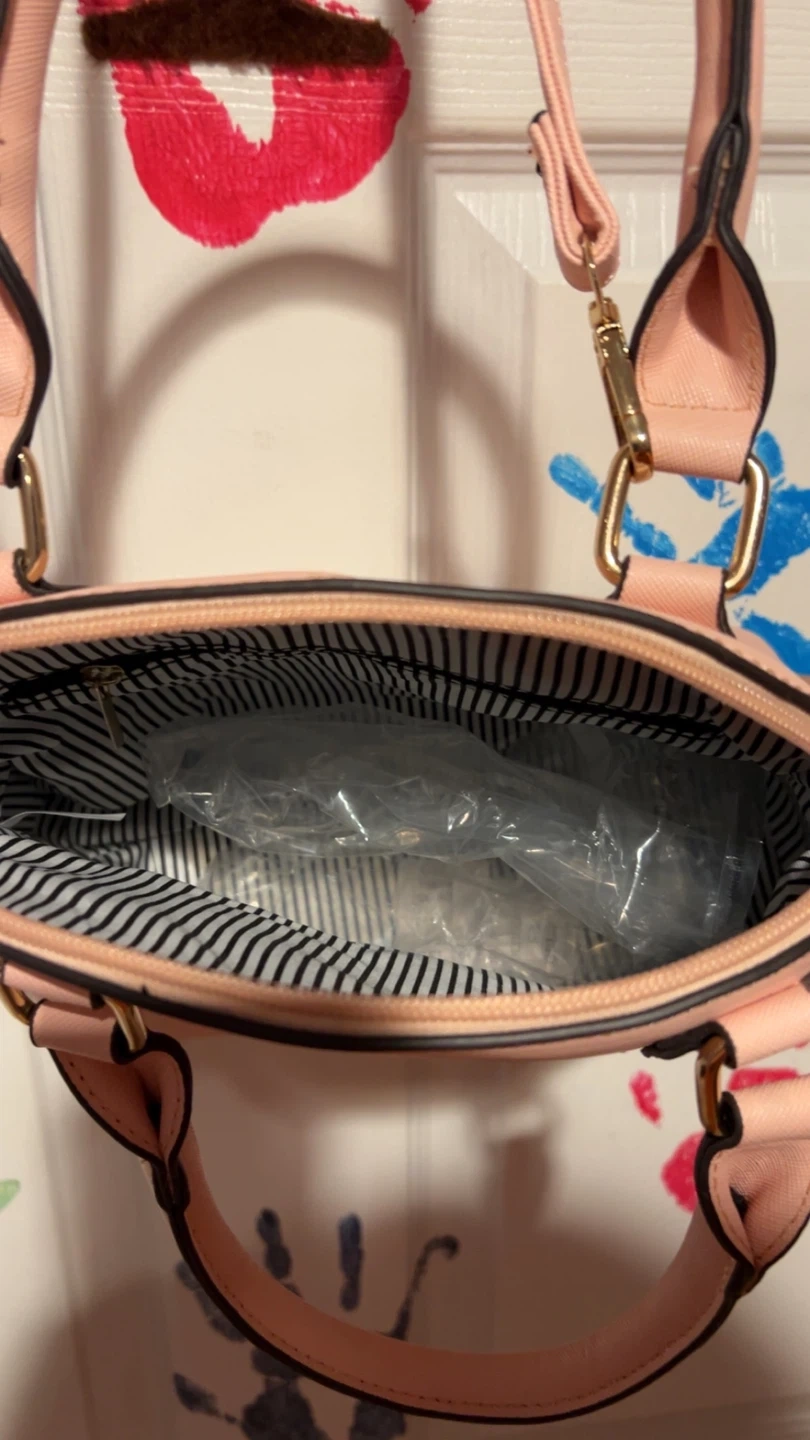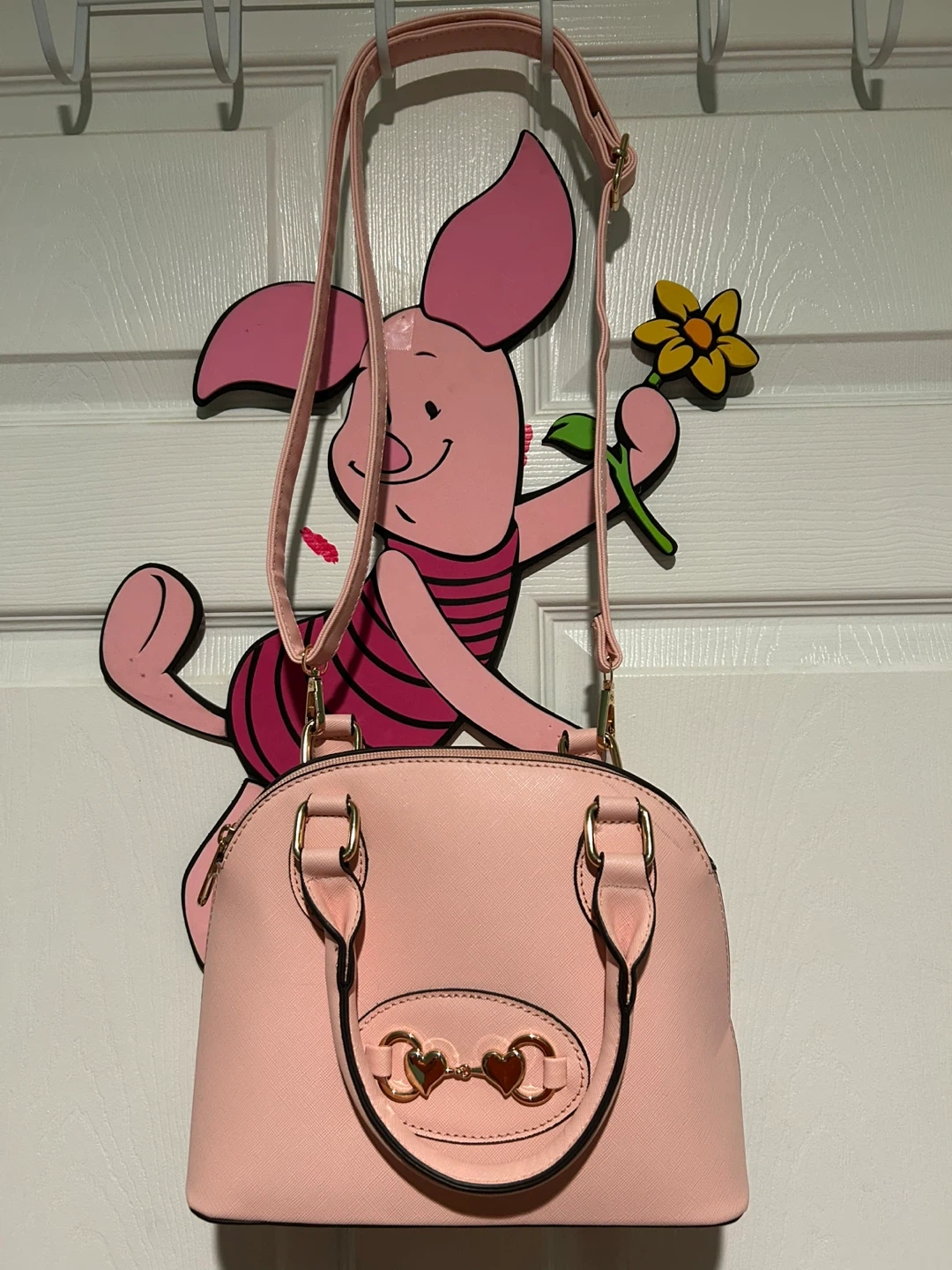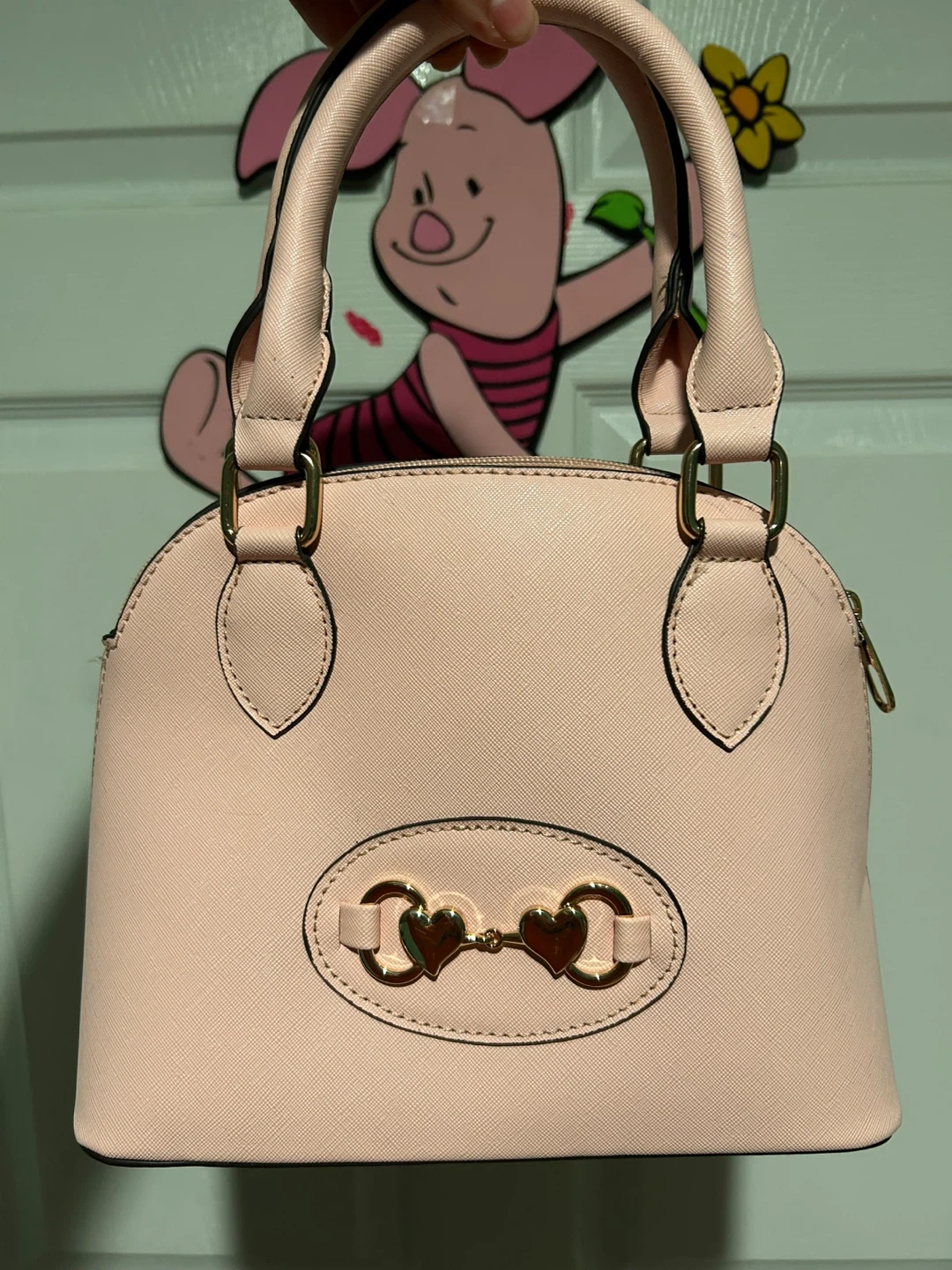 15Cute pink dome handbag with heart detail. It comes with an adjustable shoulder strap. The interior lining is black and white striped. Perfect for adding a touch of sweetness to any outfit!
