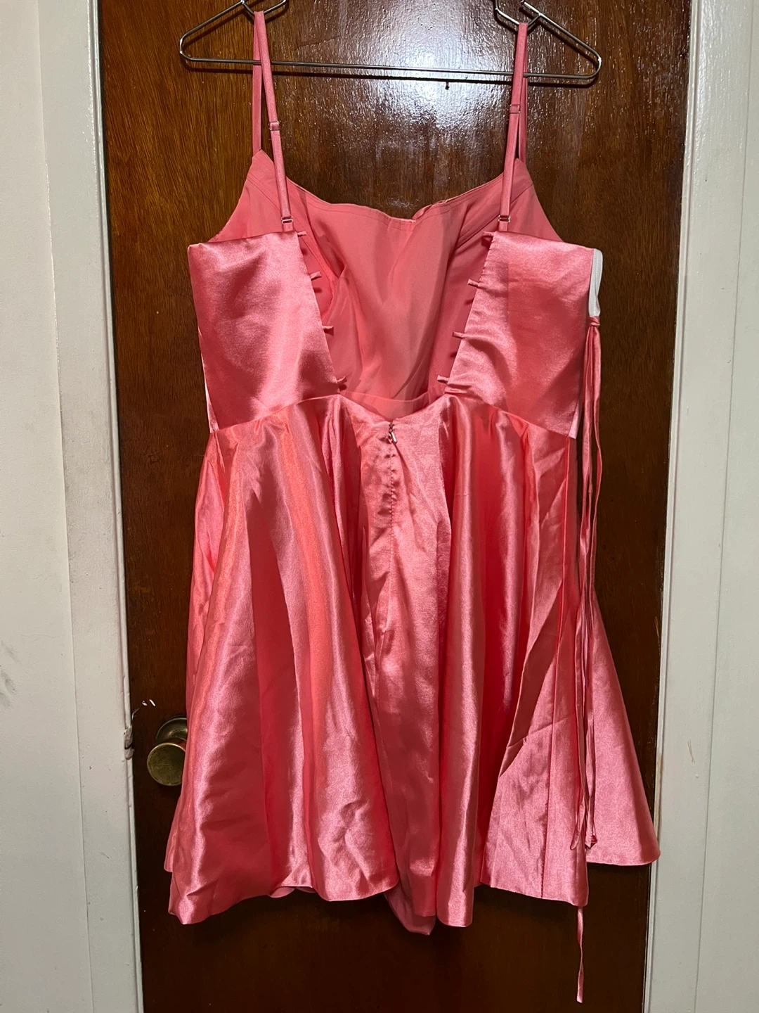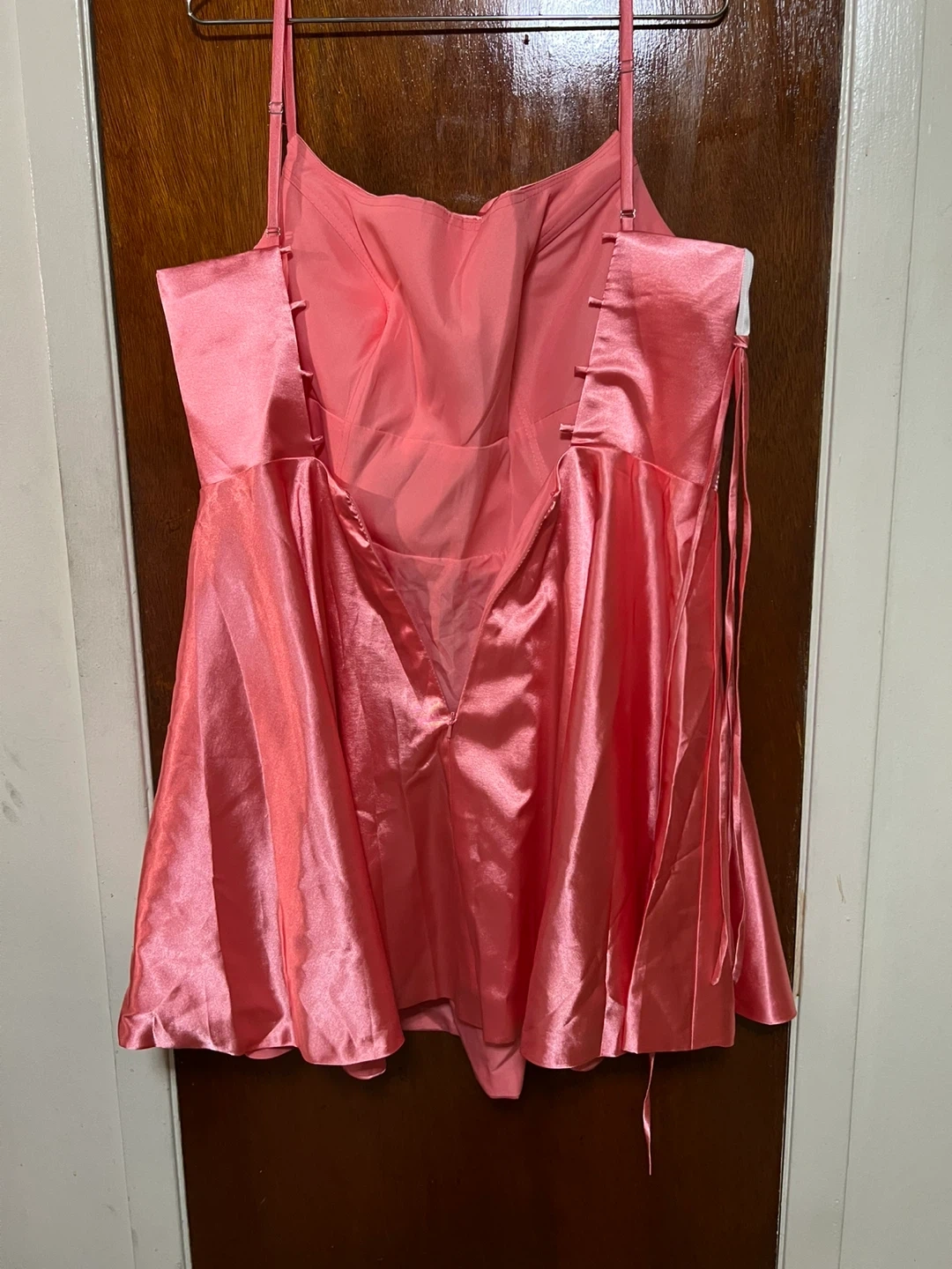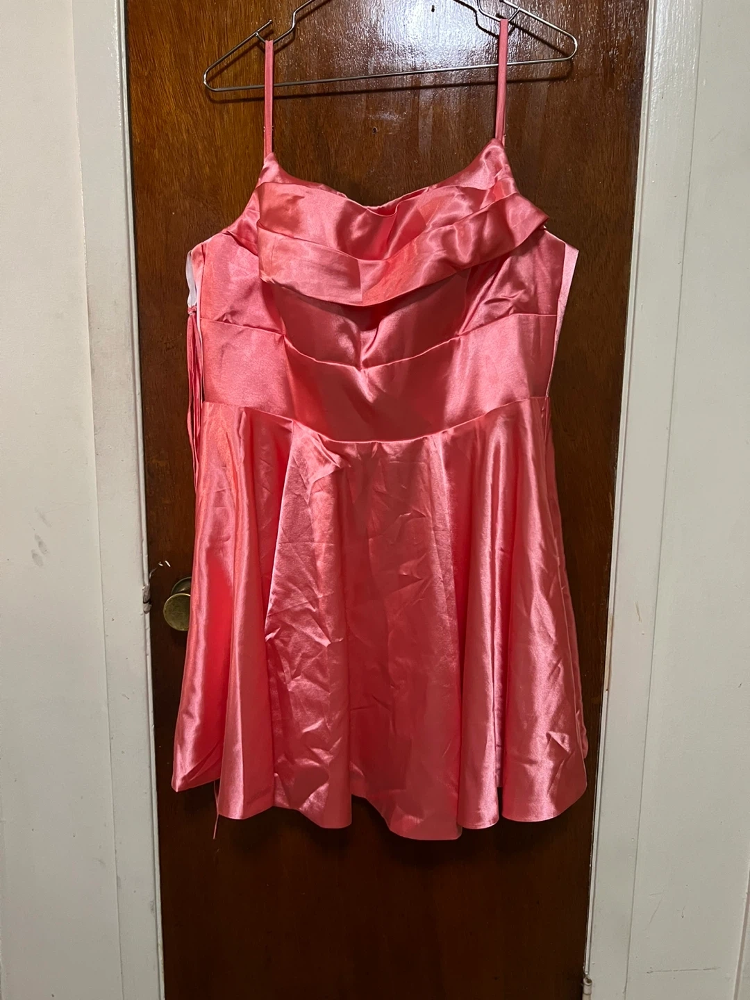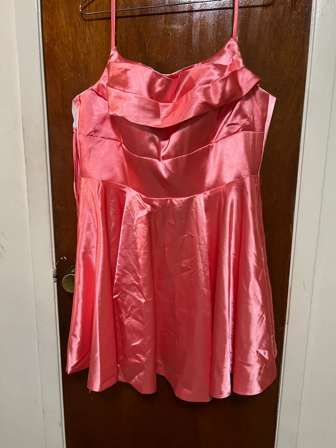 5Selling a cute pink dress! It has a ruffled neckline and a short, flared skirt. The material has a slight sheen to it, making it perfect for a party or special occasion