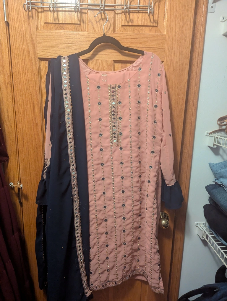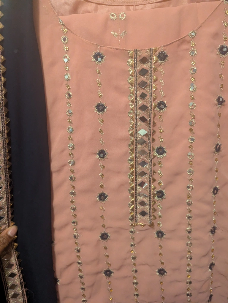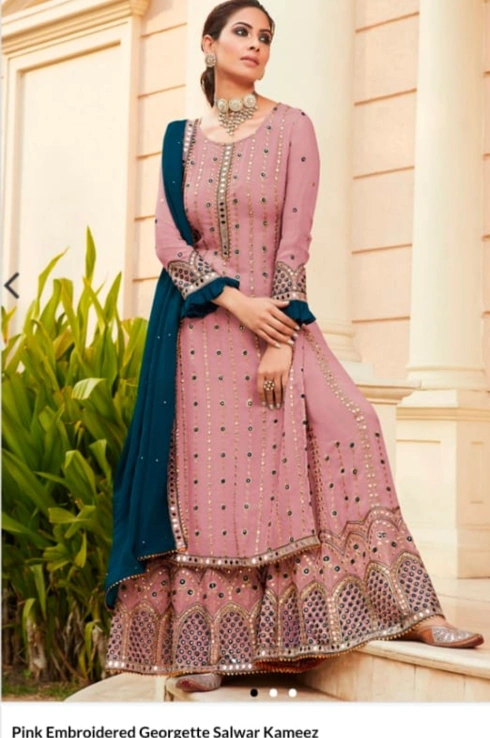 This is a pink embroidered georgette Salwar Kameez. The set includes a top, pants, and a dupatta. It features beautiful embroidery and mirror work detailing. Perfect for special occasions!
