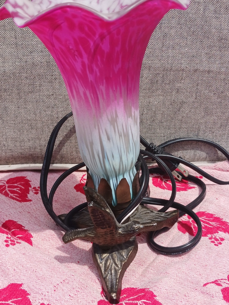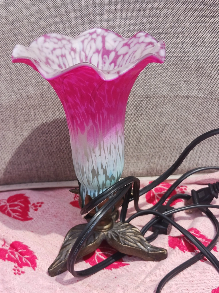 Add a touch of whimsy to your space with this unique pink floral accent lamp! The lamp features a beautiful pink and white glass shade in the shape of a flower, complemented by a bronze-colored base with leaf accents. It's perfect for adding a soft glow to any room
