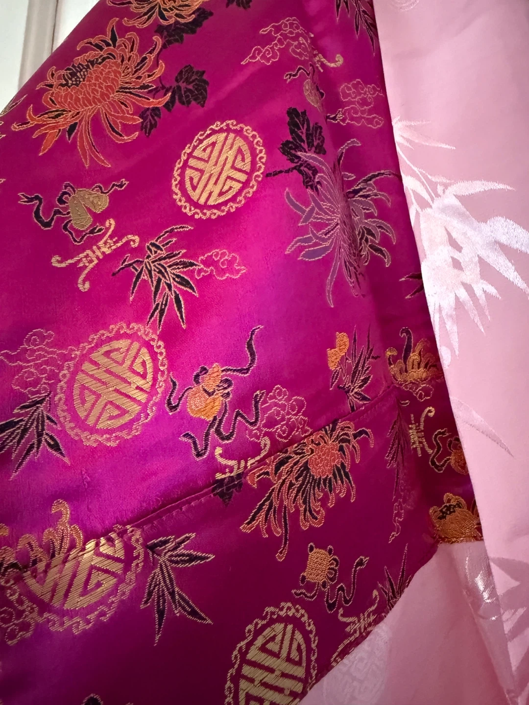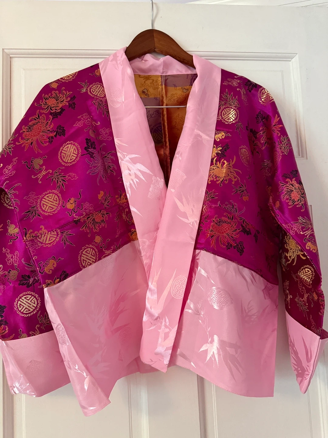 222Selling a vibrant pink tibetan, sherpa jacket with a beautiful floral pattern! It's in great condition and would be a stylish addition to any wardrobe especially with Chuba and bakkhuThe jacket features a unique design with gold accents and a silky texture. Perfect for layering or as a statement piece🥕