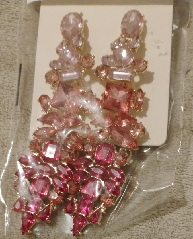 36These are a pair of new, eye-catching pink gemstone dangle earrings! They feature a mix of different gemstone shapes and shades of pink, perfect for adding a touch of glam to any outfit