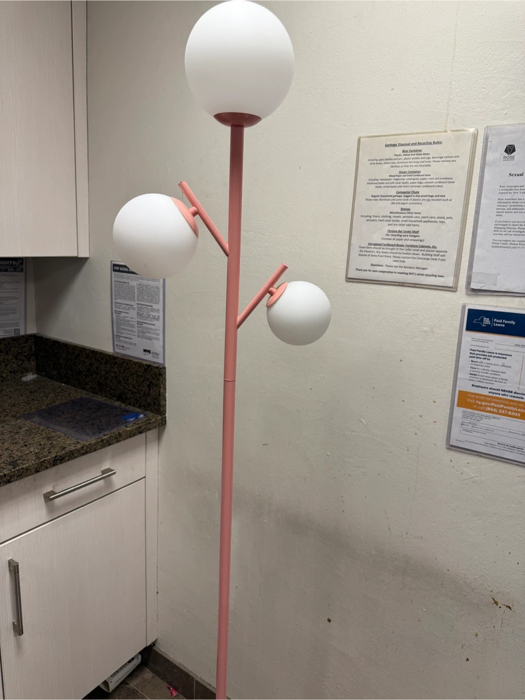 79I'm selling a stylish floor lamp featuring a pink stem and three globe lights. It's a great addition to any room, providing a modern and chic look. The lamp is in good condition and ready to brighten up your space!