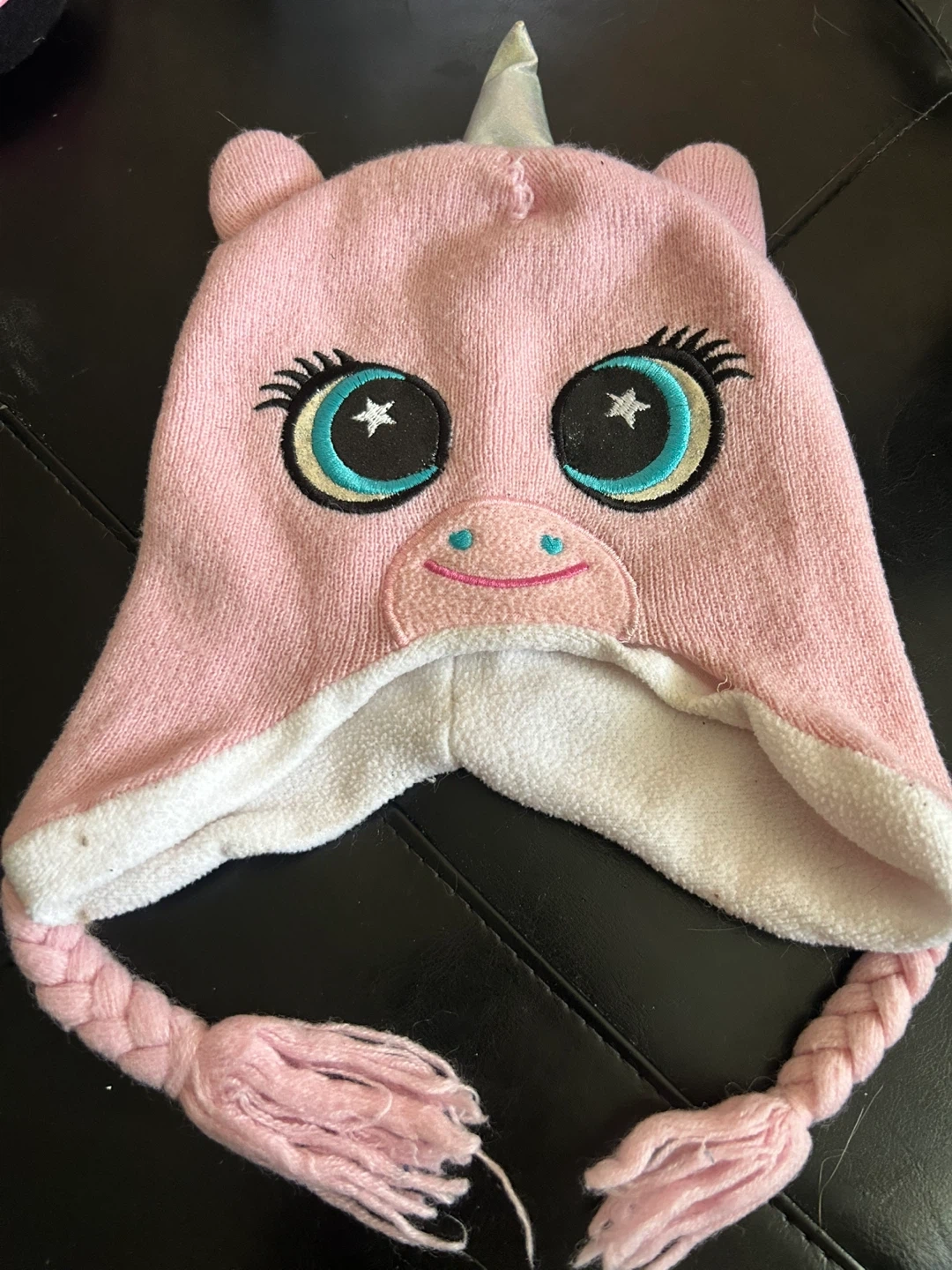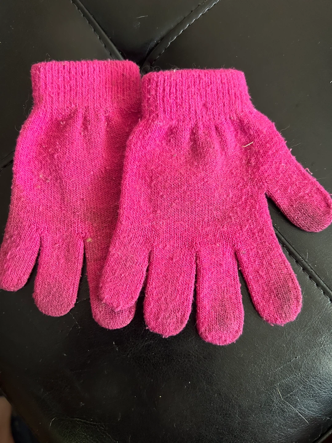 I'm selling a pair of pink gloves and a pink unicorn hat. Both items are used but in good condition.