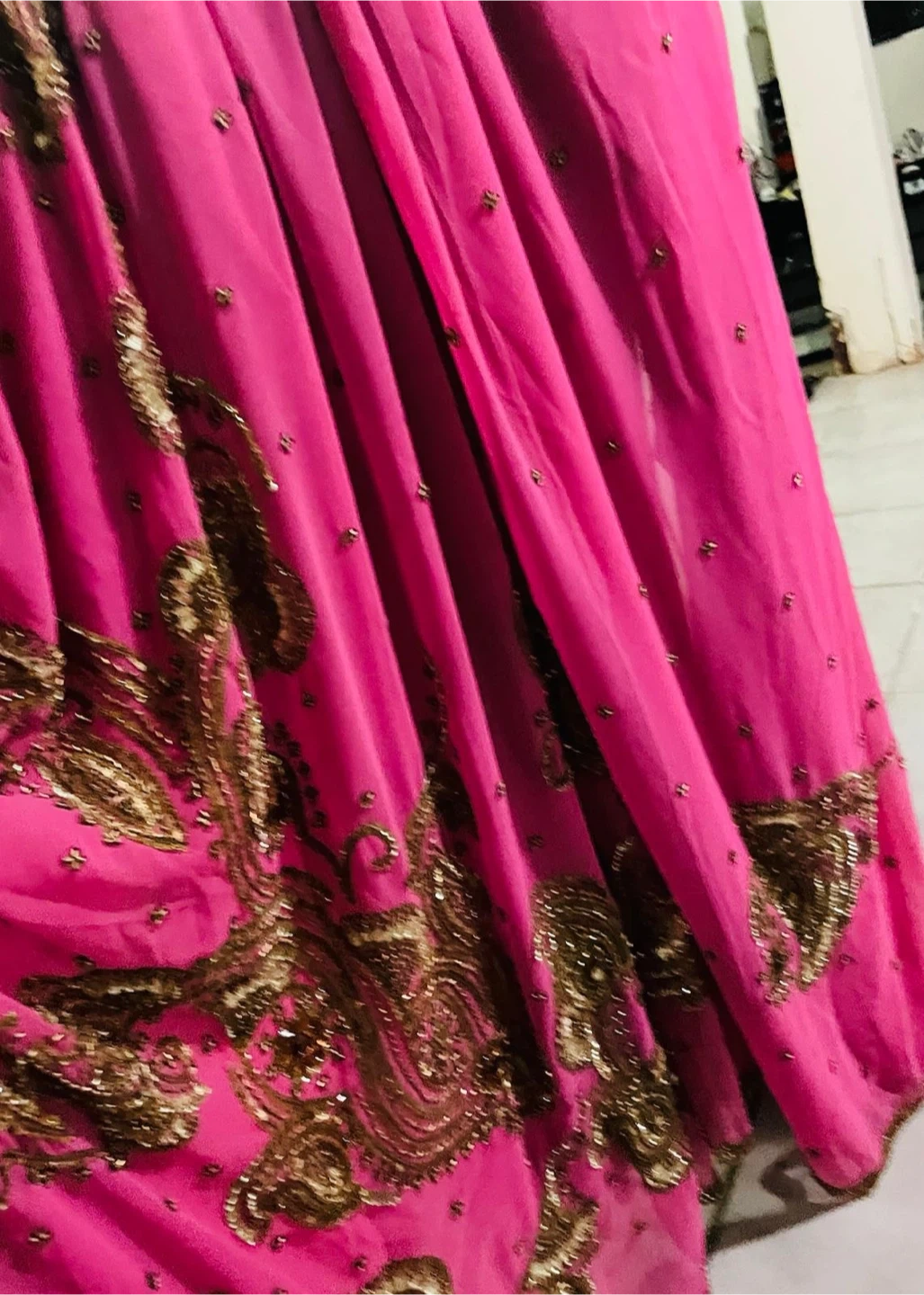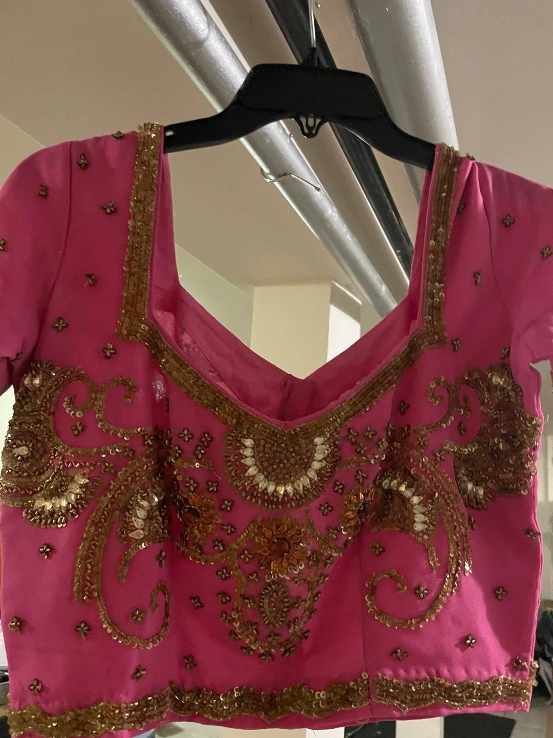Beautiful pink Indian outfit with gold embellishments! The intricate detailing adds a touch of elegance. Perfect for special occasions or cultural events