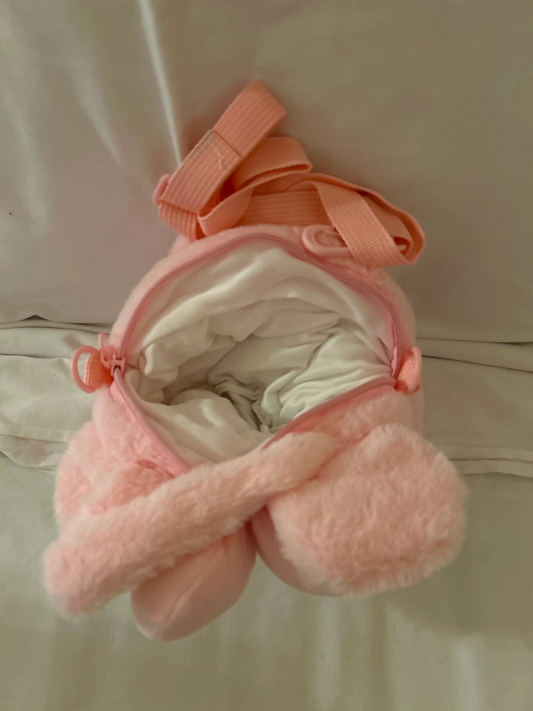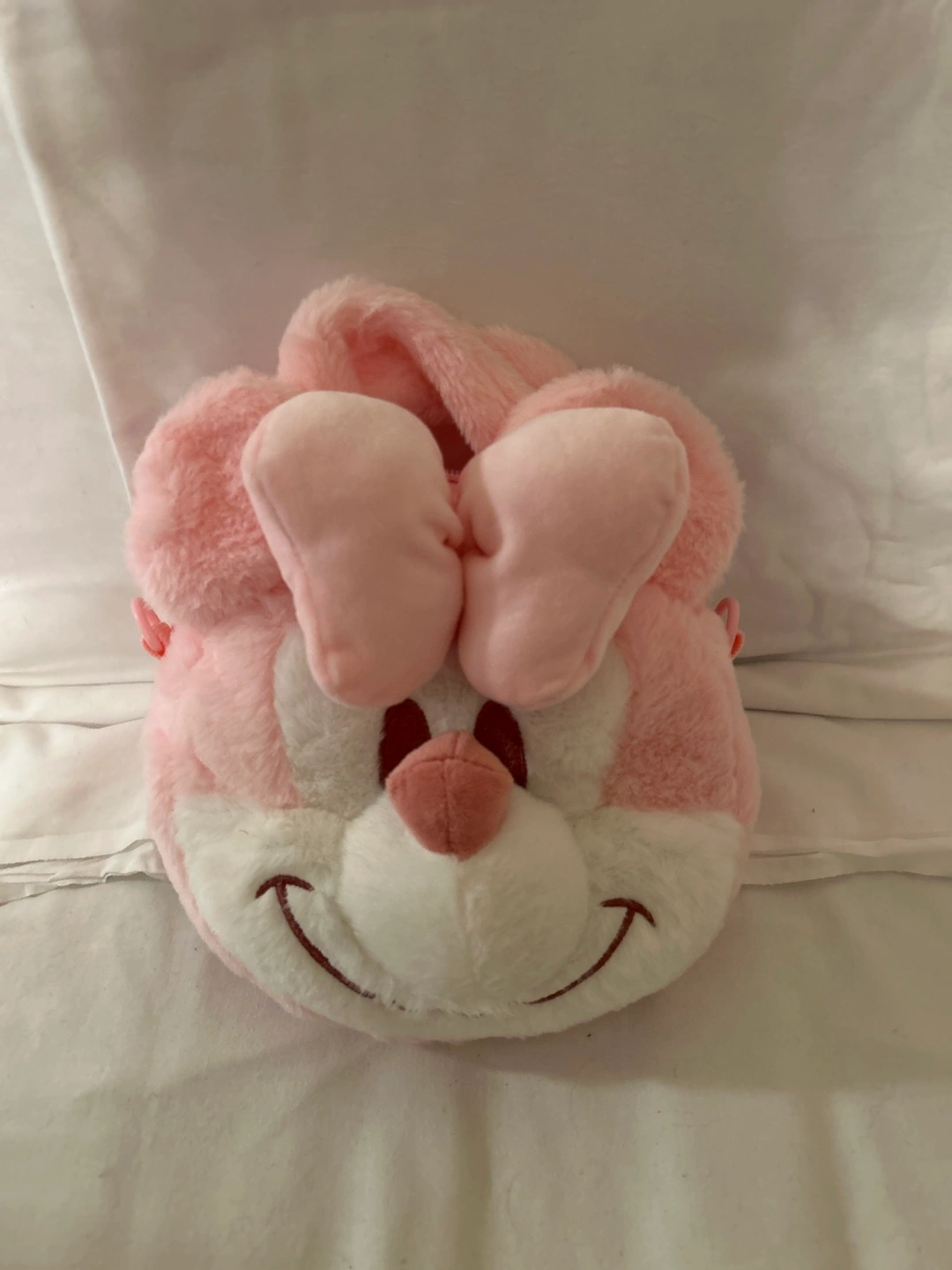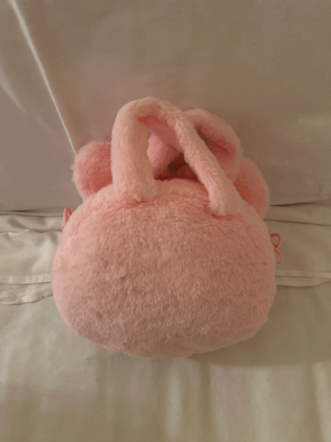 49Pink plush handbag with a character face. Has an adjustable strap.