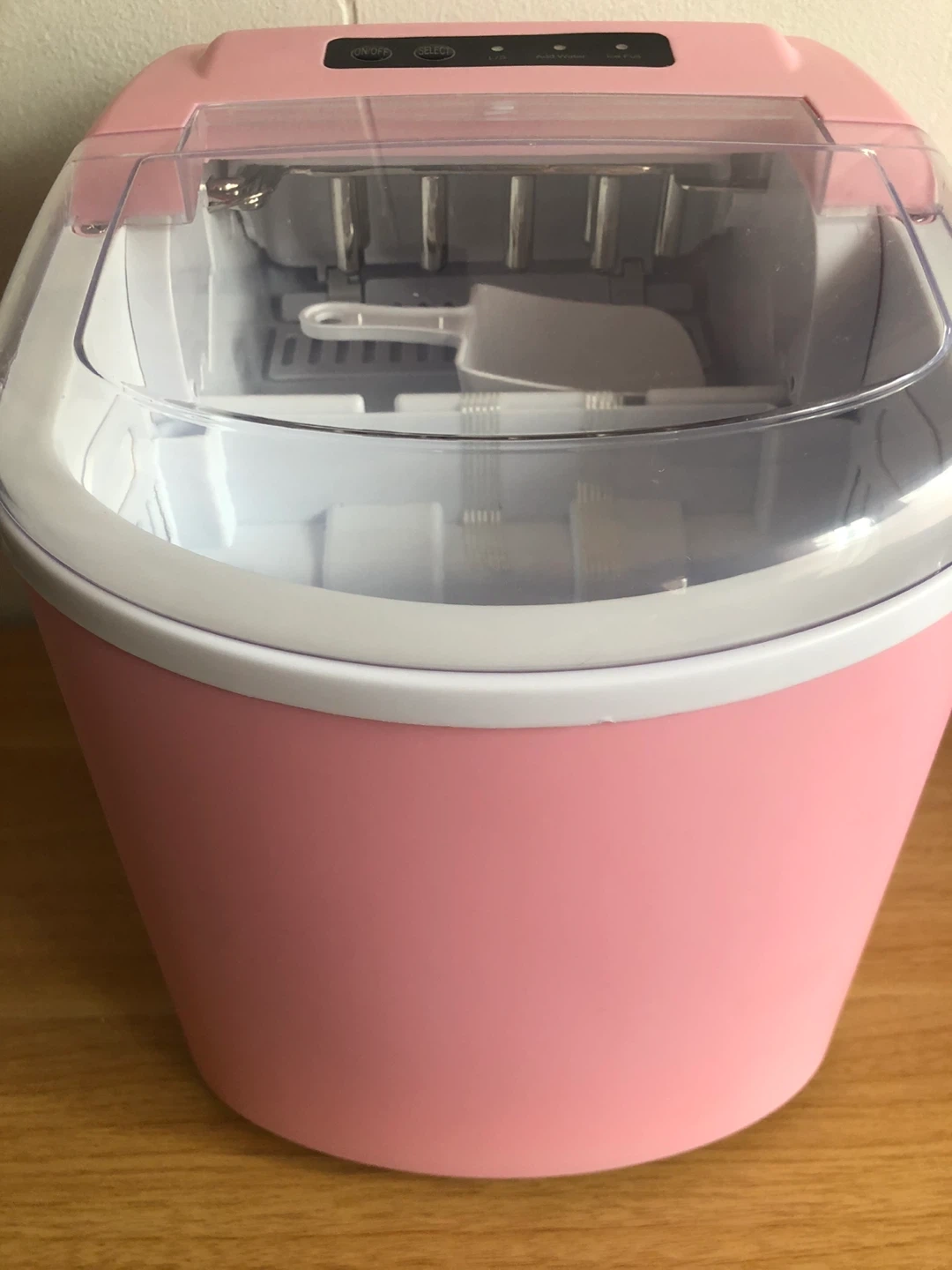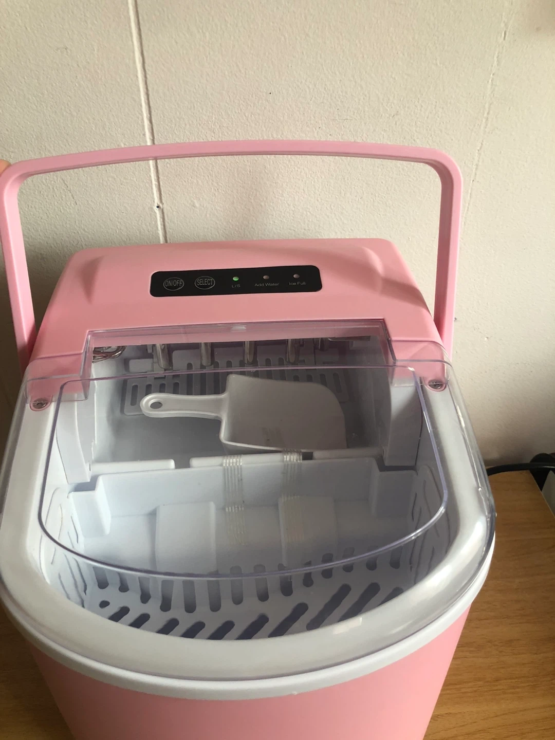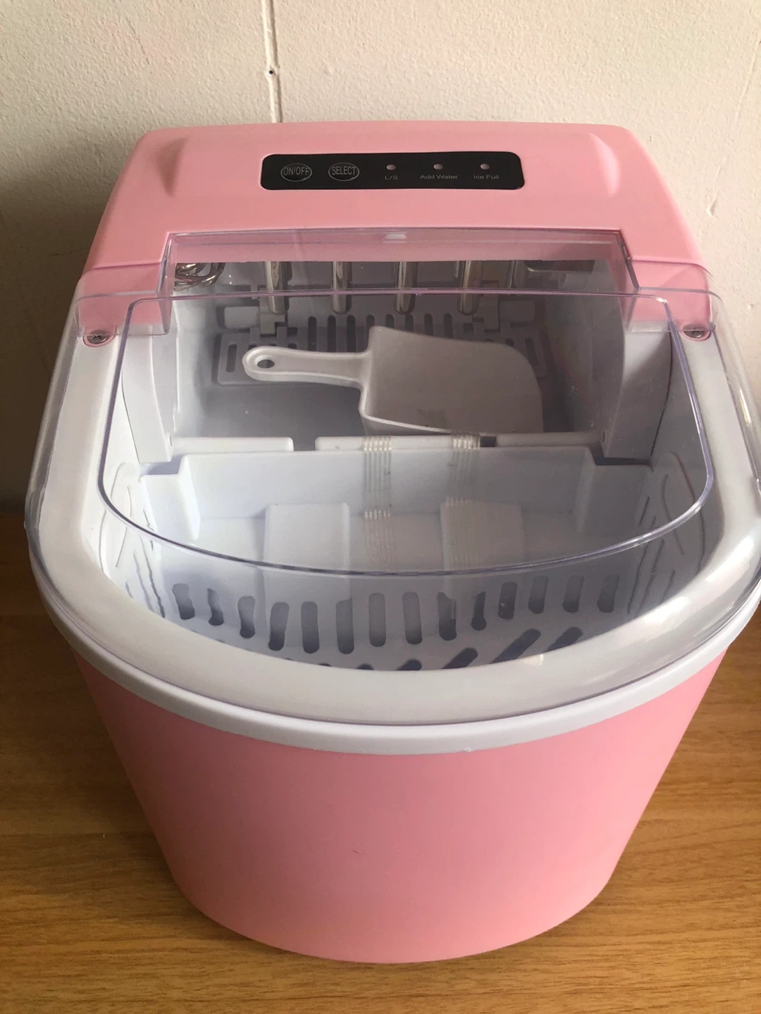 Selling a cute pink portable ice maker! It's in great condition and perfect for making ice quickly. It includes a scoop for easy ice removal and has settings for different ice sizes. Great for parties, camping, or just having ice on hand