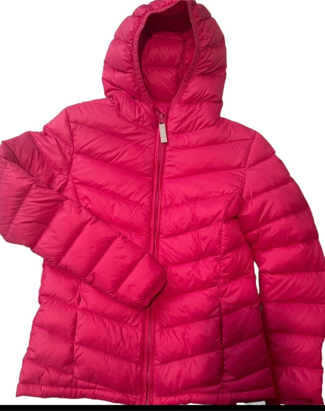 A cozy pink puffer jacket, perfect for staying warm on chilly days! It features a hood and a zip-up front