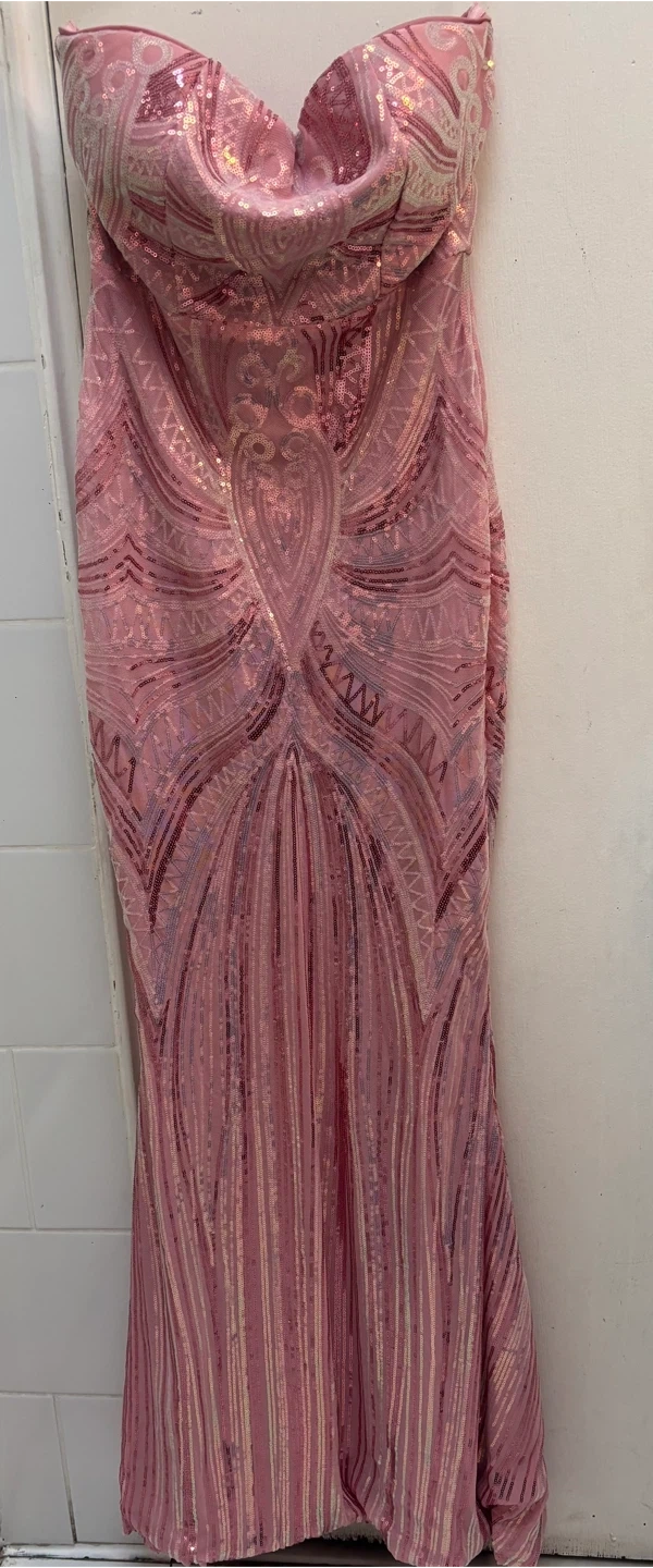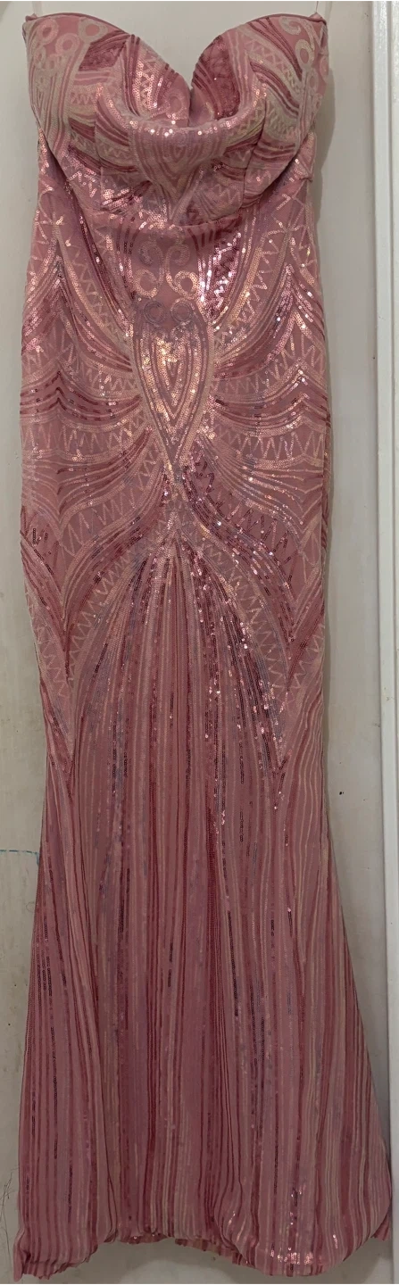 55This is a beautiful pink strapless dress with sequin detailing. It's perfect for a special occasion!
