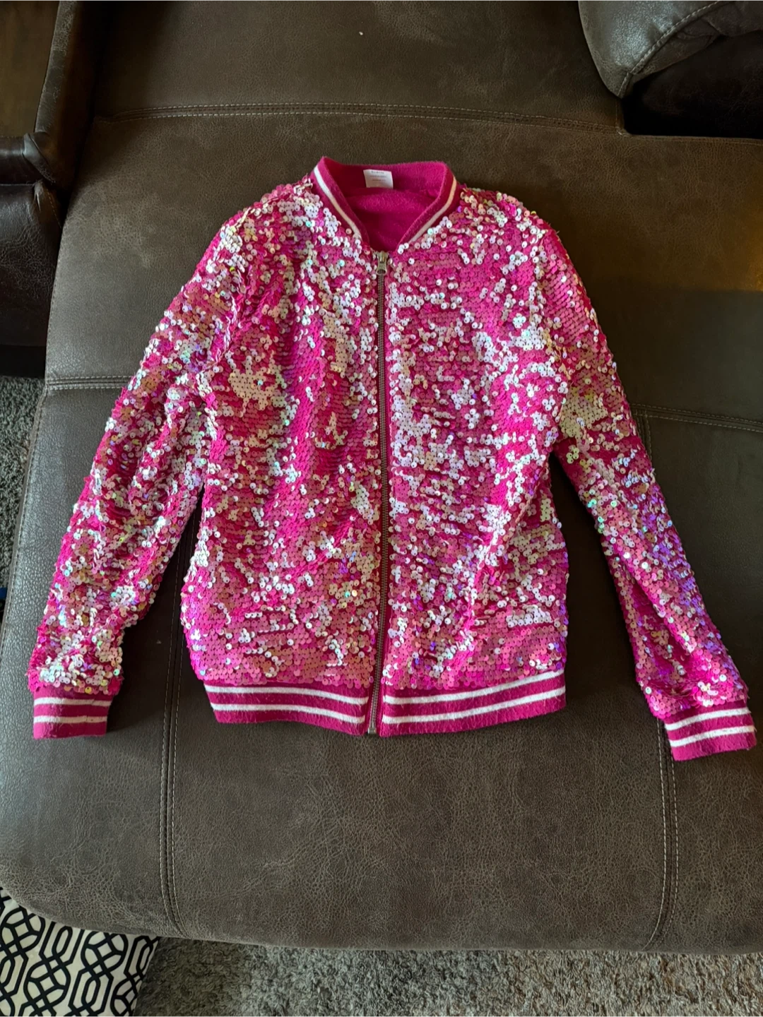 This is a super fun pink jacket with sequins! It has a zipper down the front and white stripes on the cuffs and hem. Perfect for adding a little sparkle to any outfit