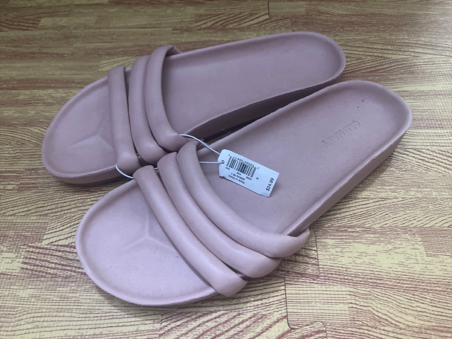 Stylish slides in a neutral color. Made with padded straps and a comfortable sole. Perfect for a relaxing day at the beach or by the pool.
